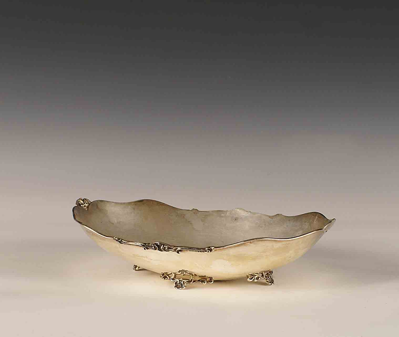 Centrotavola in argento di forma ovale, poggiante su quattro piedini, vecchia manifattura, gr. 409.