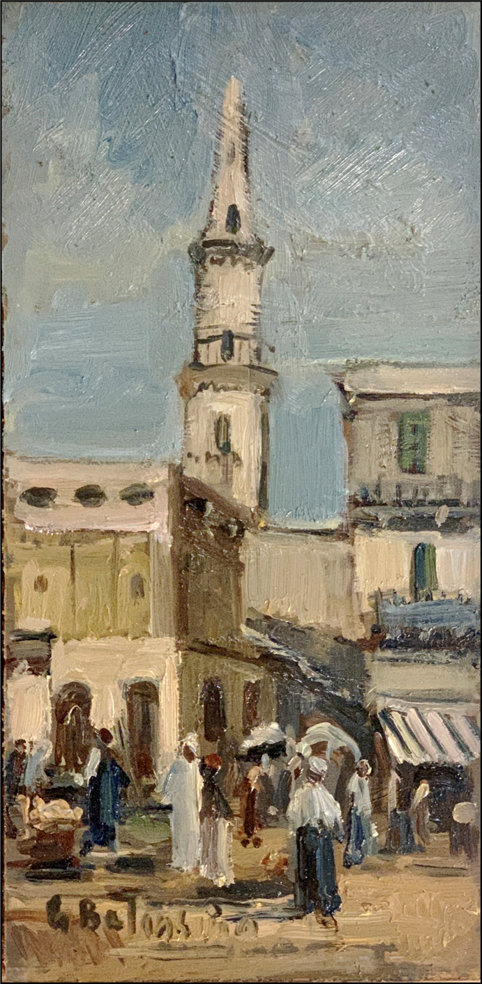 BALANSINO GIOVANNI Cuneo 1912 - Milano 1986 "Paesaggio con architetture e mercato" Olio su tela cm 20x40. Firmato sul fronte in basso, verso il centro.