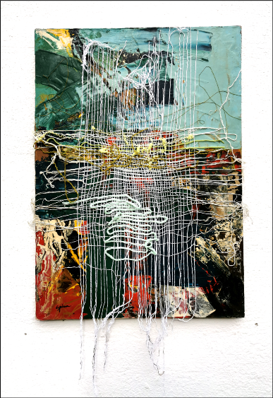 SPINA ROSA Giarre 1946 "Senza titolo" De-filage e tecnica mista su tela cm 50x70 degli anni '60. Opera pubblicata sul catalogo "Il filo della discordia" a pag. 22, Palazzo della Ragione Romano di Lombardia 2021.
