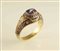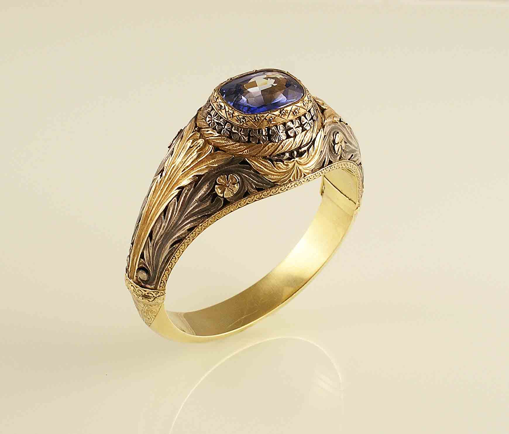 Particolare bracciale a manetta in oro bianco e giallo inciso e decorato a motivo floreale con al centro incastonato uno zaffiro di sintesi taglio a cuscino, primi '900, gr. 48,3.