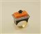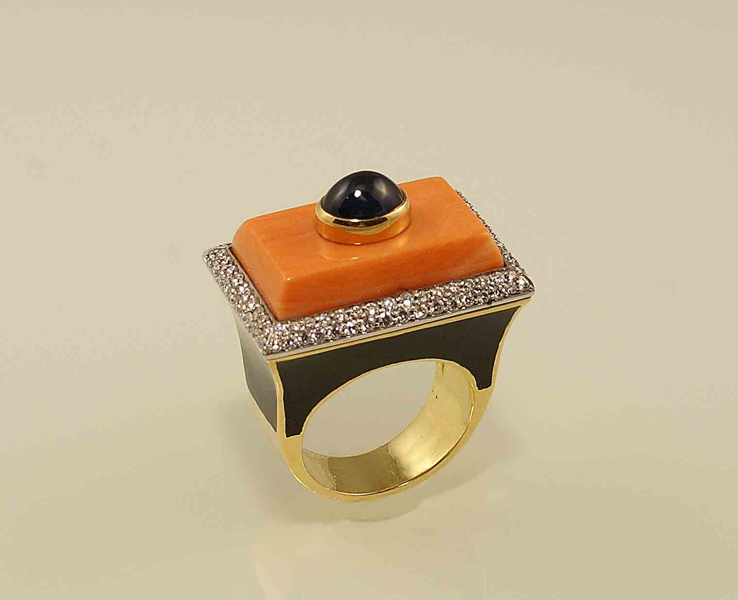 Anello in oro giallo e bianco 18kt e smalto nero con incastonati diamanti taglio brillante per carati 1,10 circa, sezione in corallo nella tonalità dell'arancio e zaffiro taglio cabochon per 0,63 punti circa, gr. 30,5.