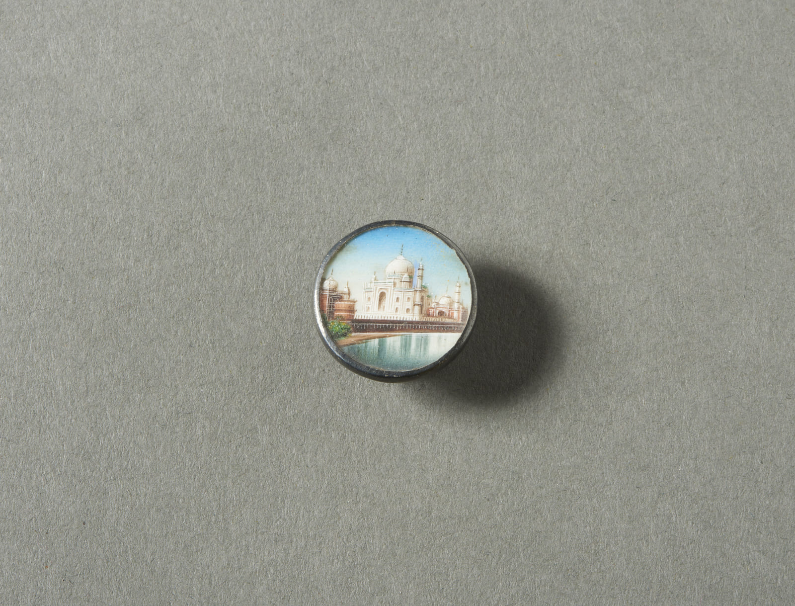 In patina. . . Cm 2,00 x 2,00. Splendida ed accurata miniatura del Taj Mahal incorniciata in argento all'interno di un bottone da asola.