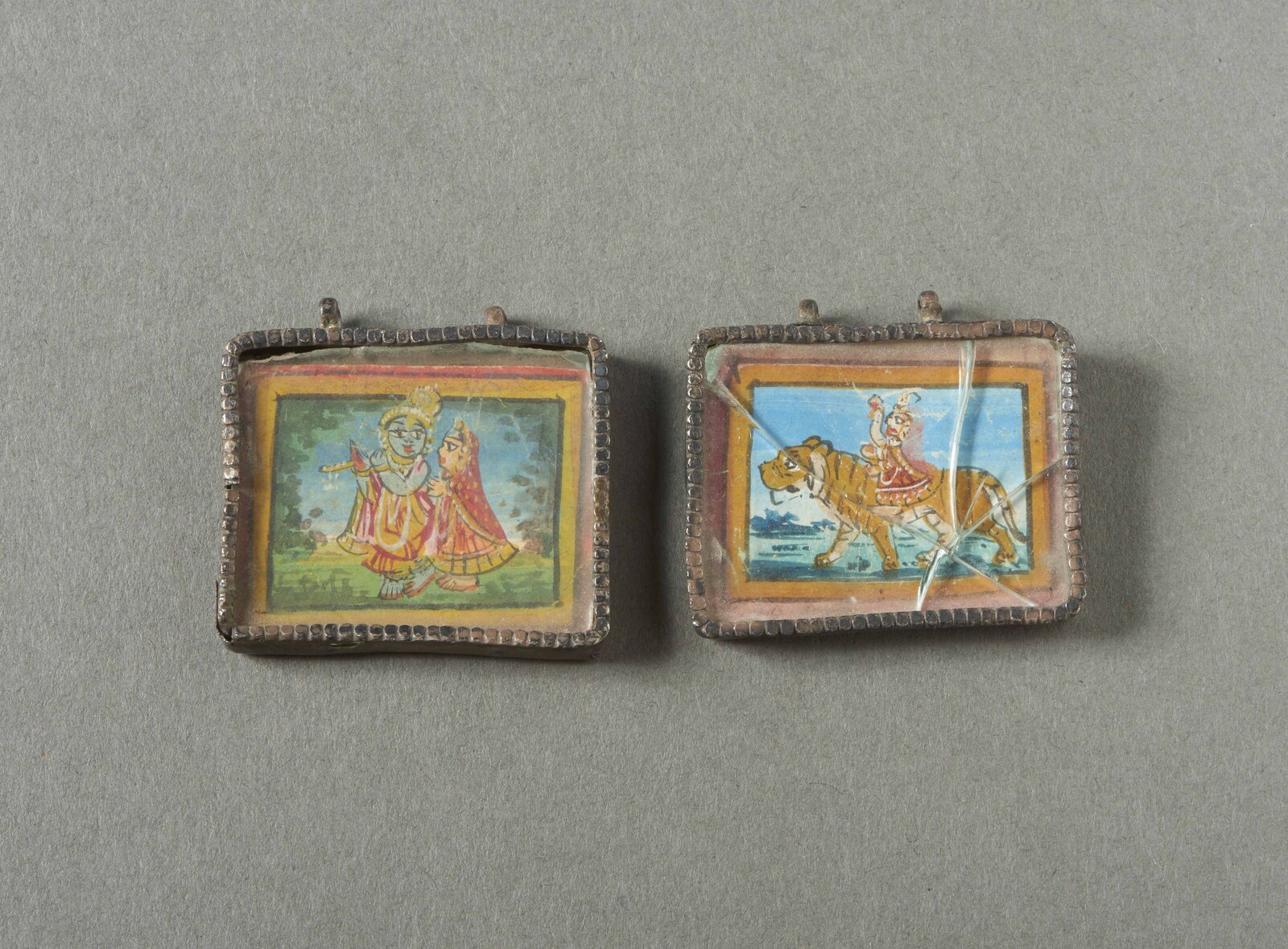 Difetti visibili, un vetro rotto e segni d'uso . . Cm 4,00 x 3,60. Lotto composto da due pendenti in argento con dipinti su carta di divinità indù