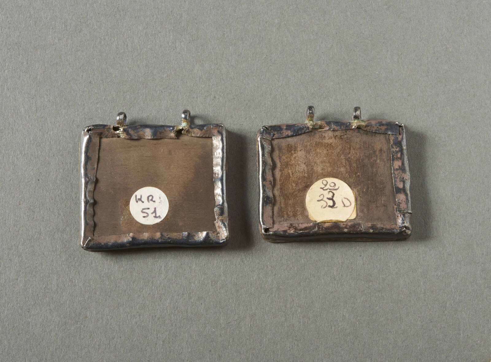 Arte Indiana - India. Due pendenti in argento, vetro carta e pigmenti. Difetti visibili, un vetro rotto e segni d'uso .