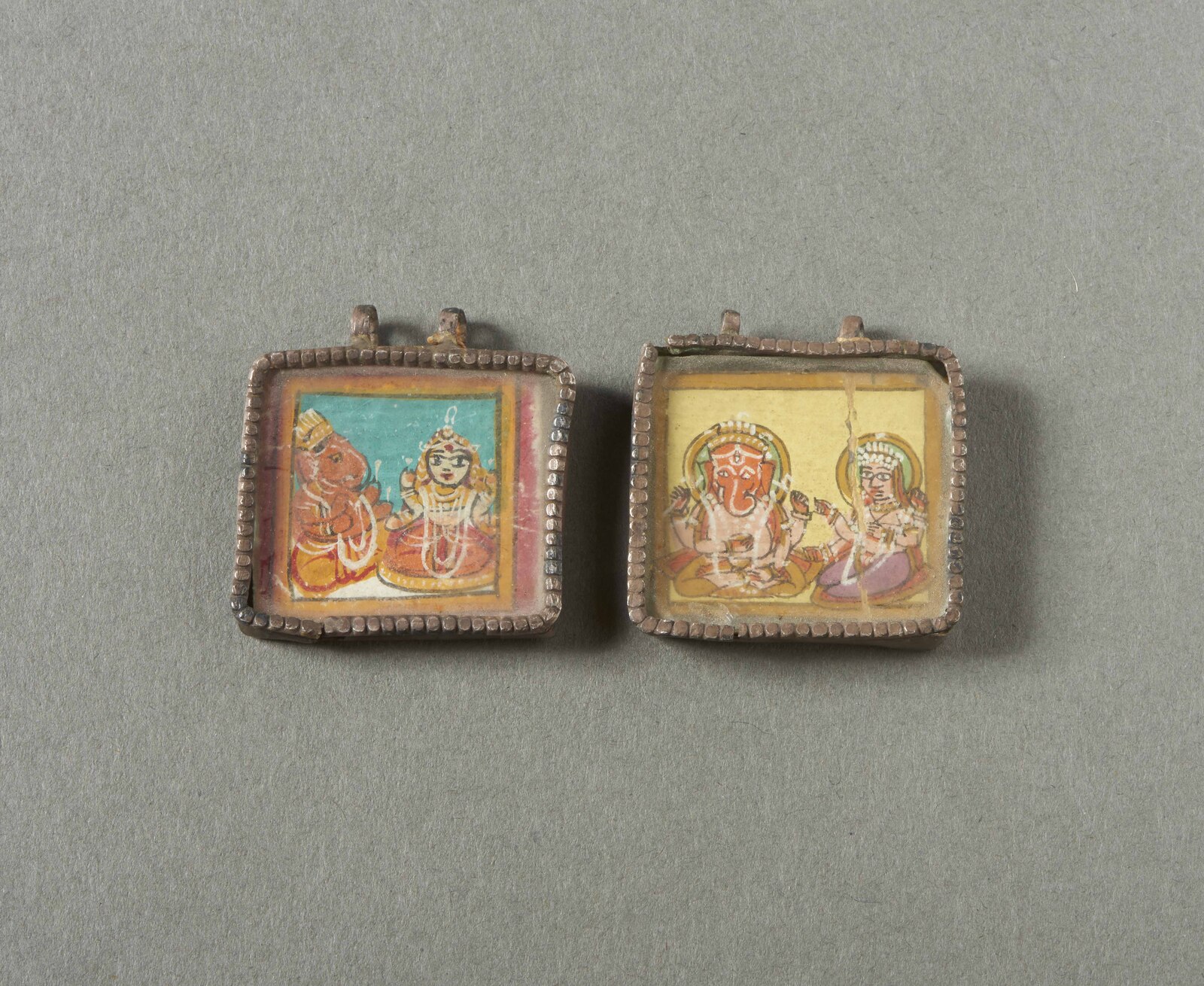 . . Cm 3,40 x 3,40. Lotto composto da due pendenti in argento con dipinti a tempera su carta con rappresentazioni di divinità indù