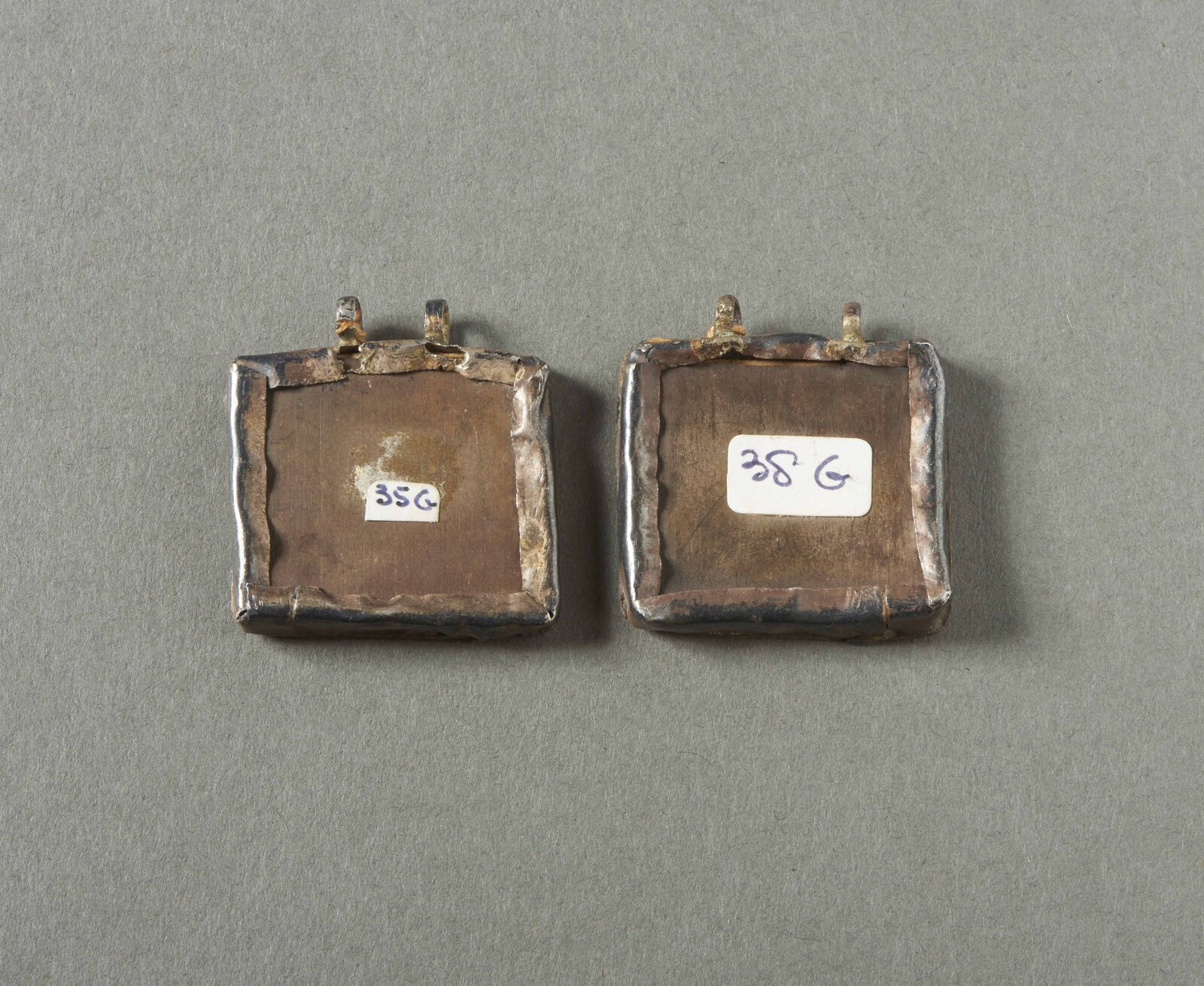 Arte Indiana - India. Due pendenti in argento, vetro carta e pigmenti. Difetti visibili, un vetro rotto e segni d'uso .