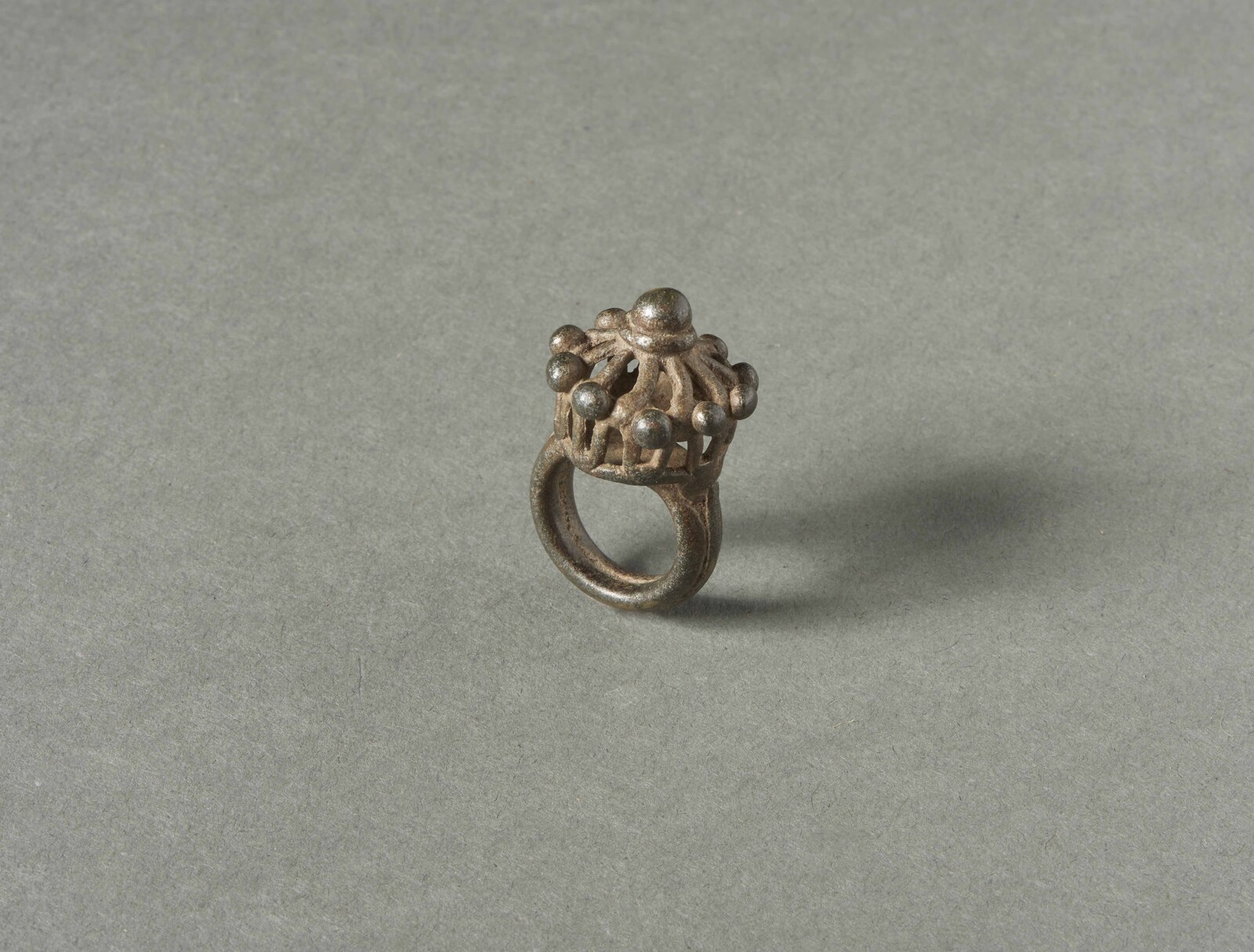 Anello in lega di rame con decorazioni geometriche a gabbia e sonaglio in pietra.