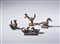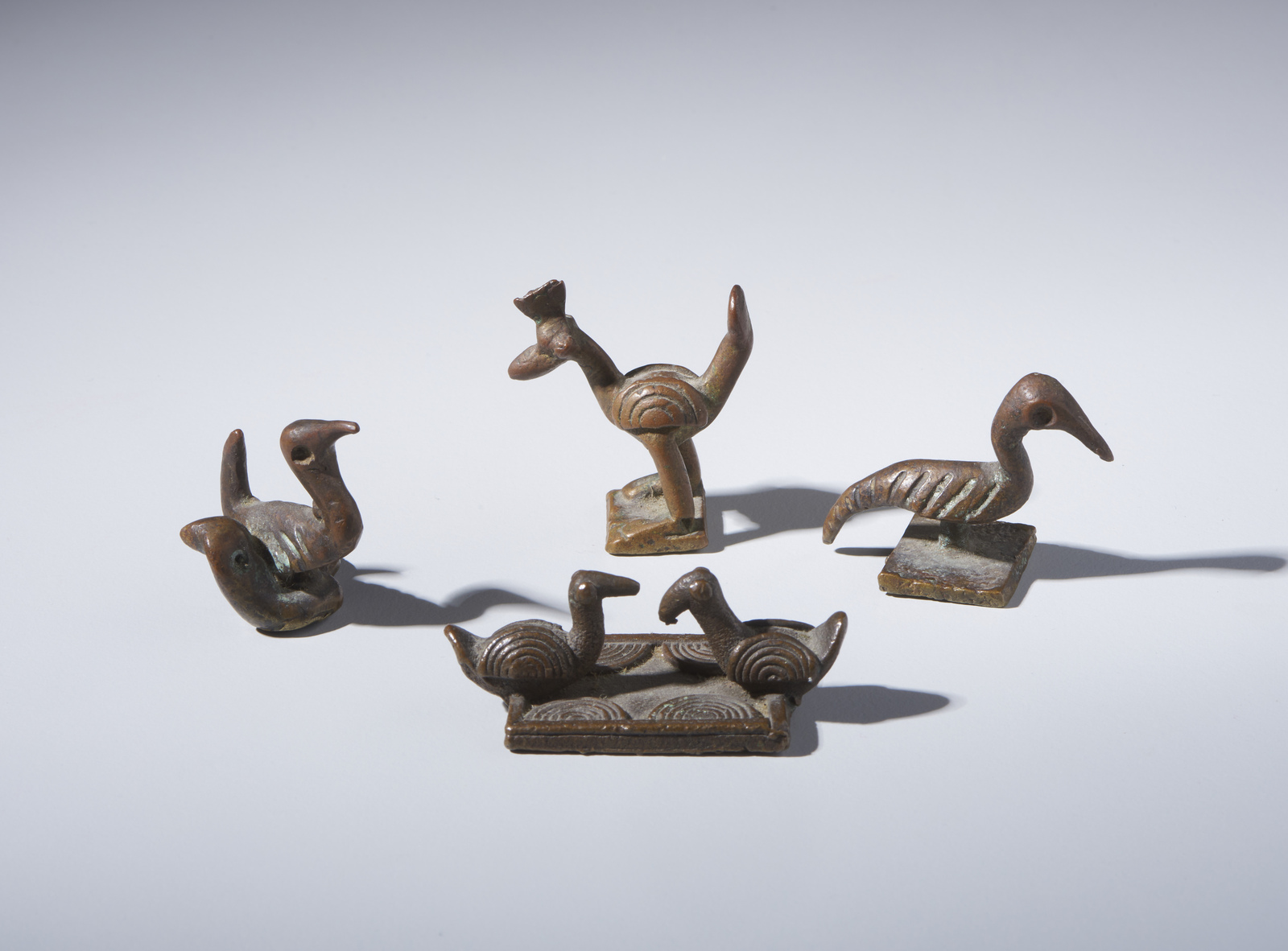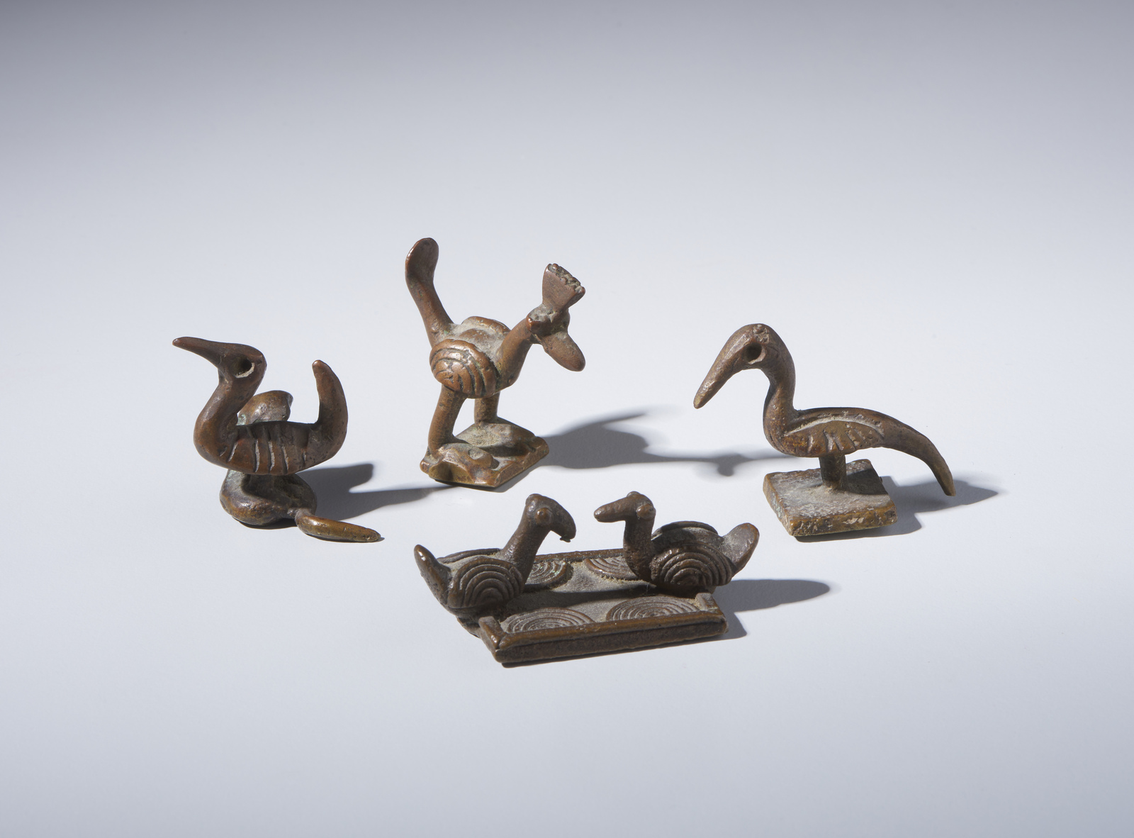 Gruppo di quattro pesi per oro in bronzo. . . Cm 2,00 x 3,80. Lotto composto da quattro pesi per oro Akan a forma di volatili di diversa qualità , dimensione, provenienza, epoca ed usura.