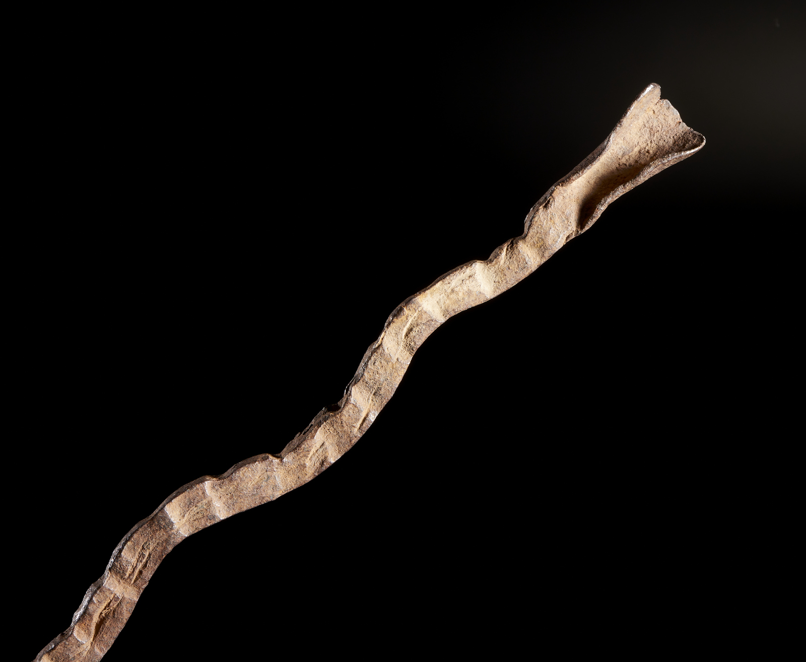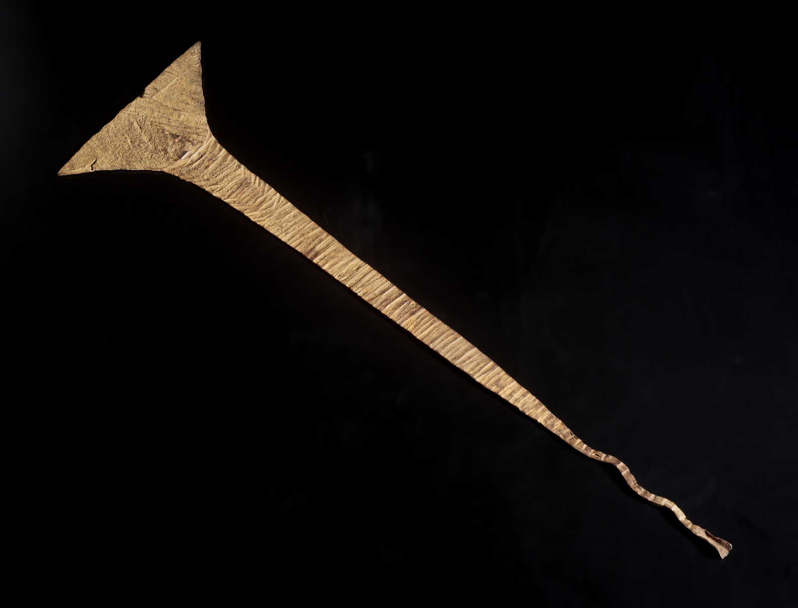 Difetti visibili e segni d'uso. . . Cm 20,00 x 72,00 x 0,50. Diffusa in buona parte dell'Africa Occidentale fino alla Nigeria, questa moneta a forma triangolare è stata realizzata in ferro forgiato e battuto con gambo tortuoso e puntale concavo.