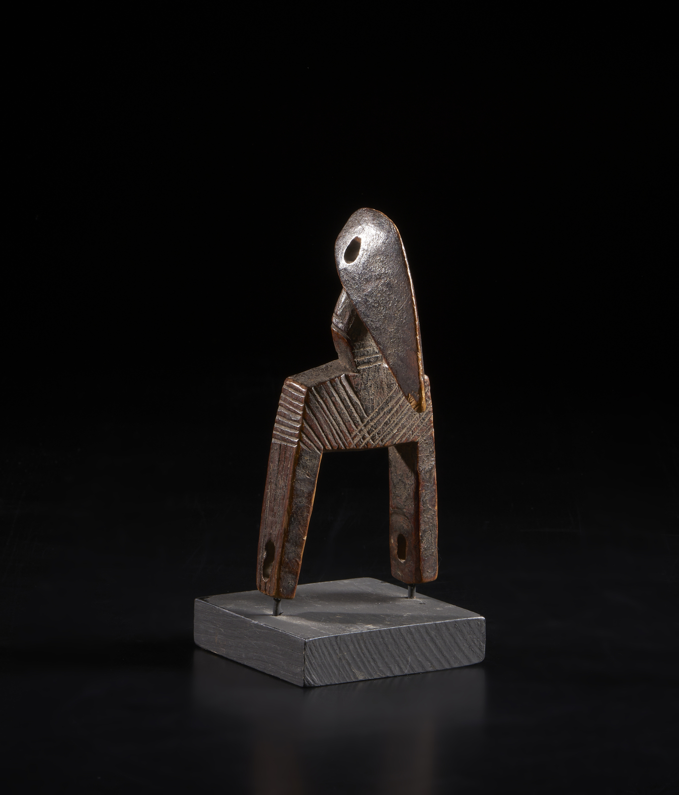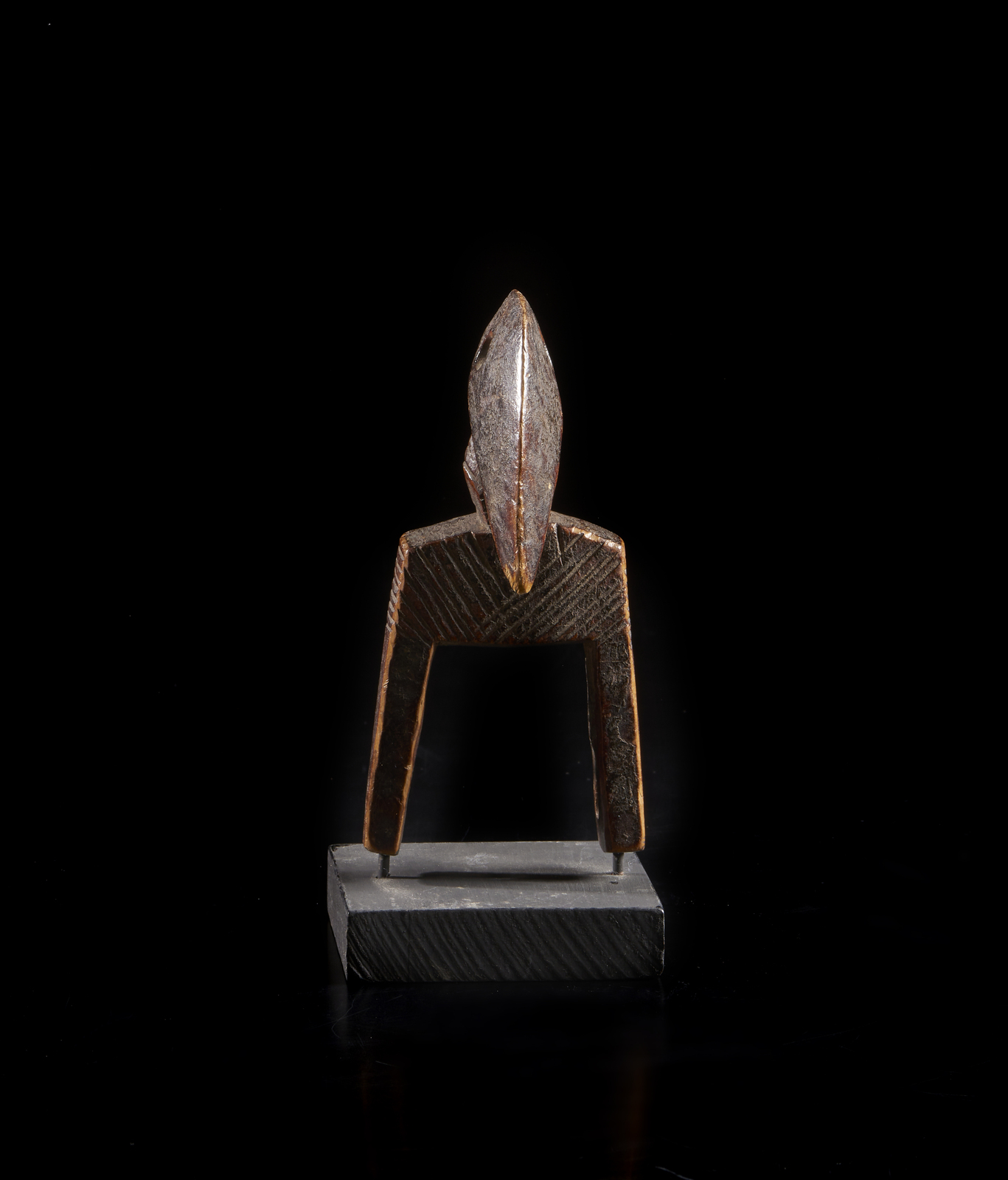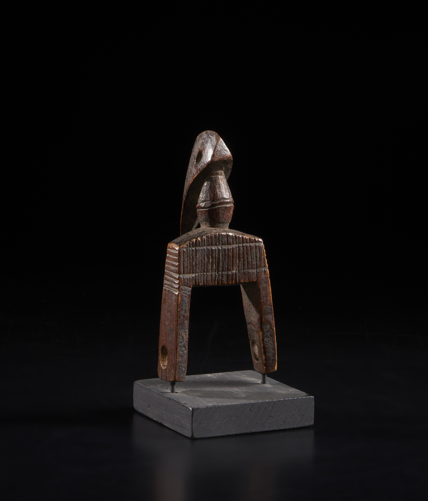 . . Cm 6,00 x 13,00 x 5,00. Puleggia da telaio caratterizzata dalla figura stilizzata dell'uccello Calao, figura mitologica tra i Senufo.
