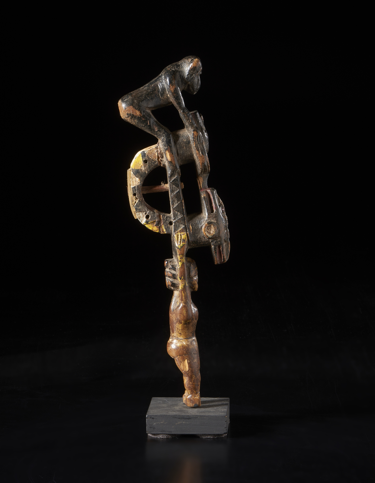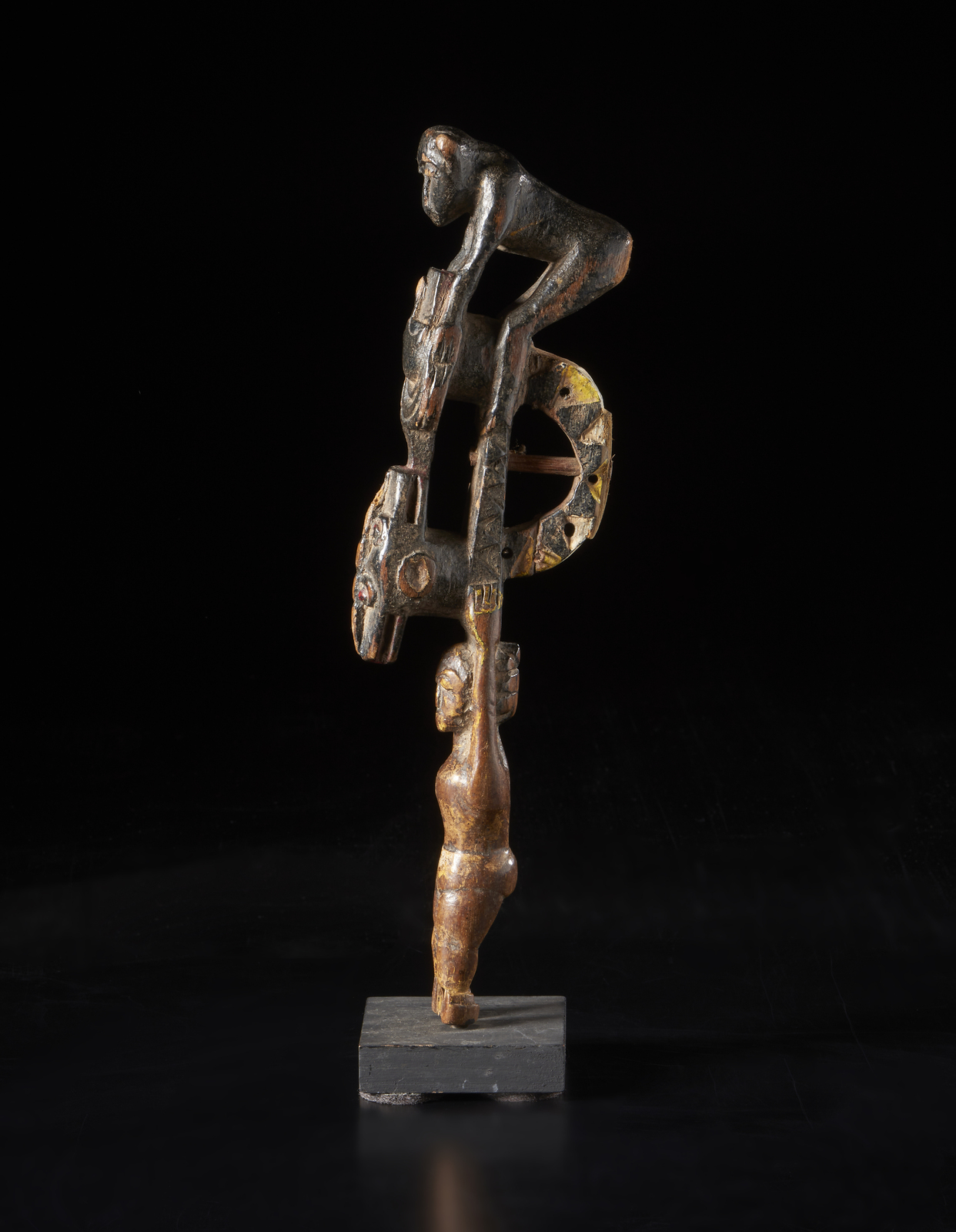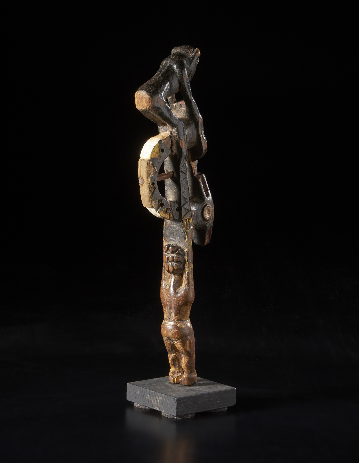 . . Cm 8,00 x 30,00 x 3,00. Complessa rappresentazione plastica di un uomo che sorregge maschere ed una scimmia. Il tutto sapientemente intagliato e dettagliatamente espresso secondo i canoni estetici della tradizione scultorea classica Baulè.
