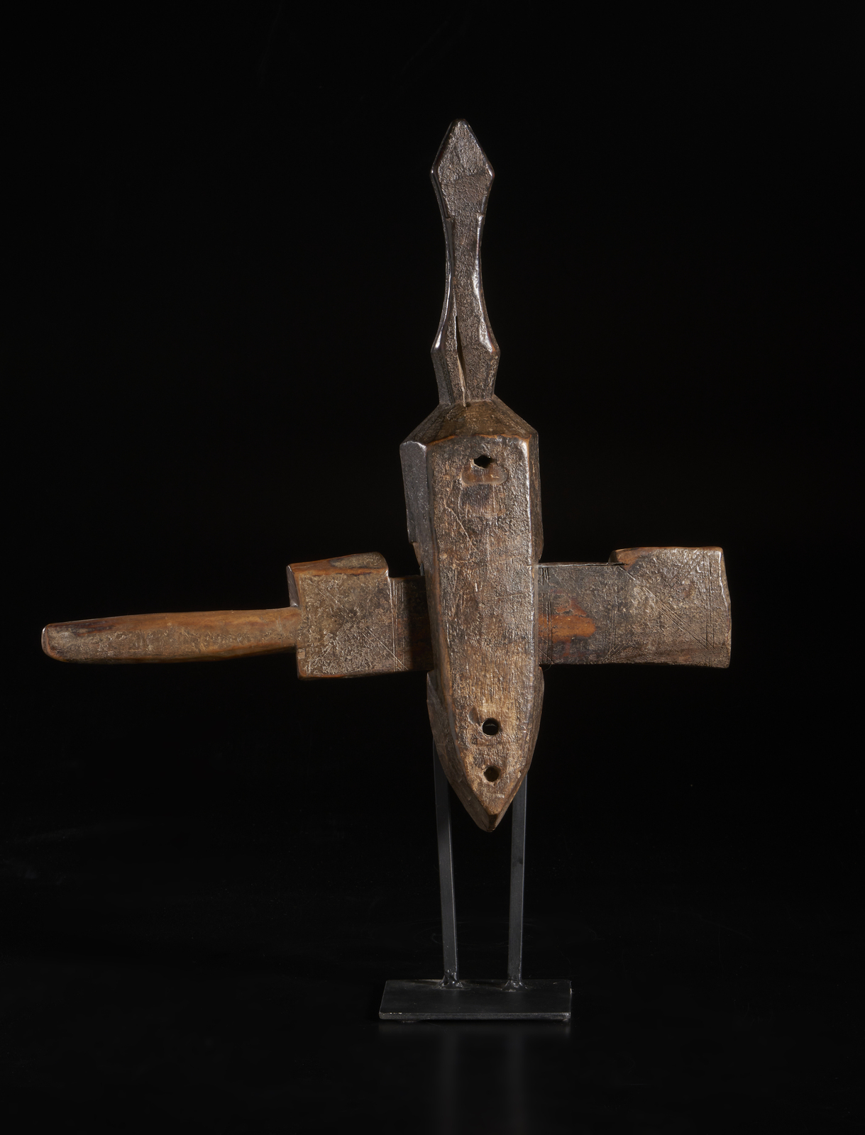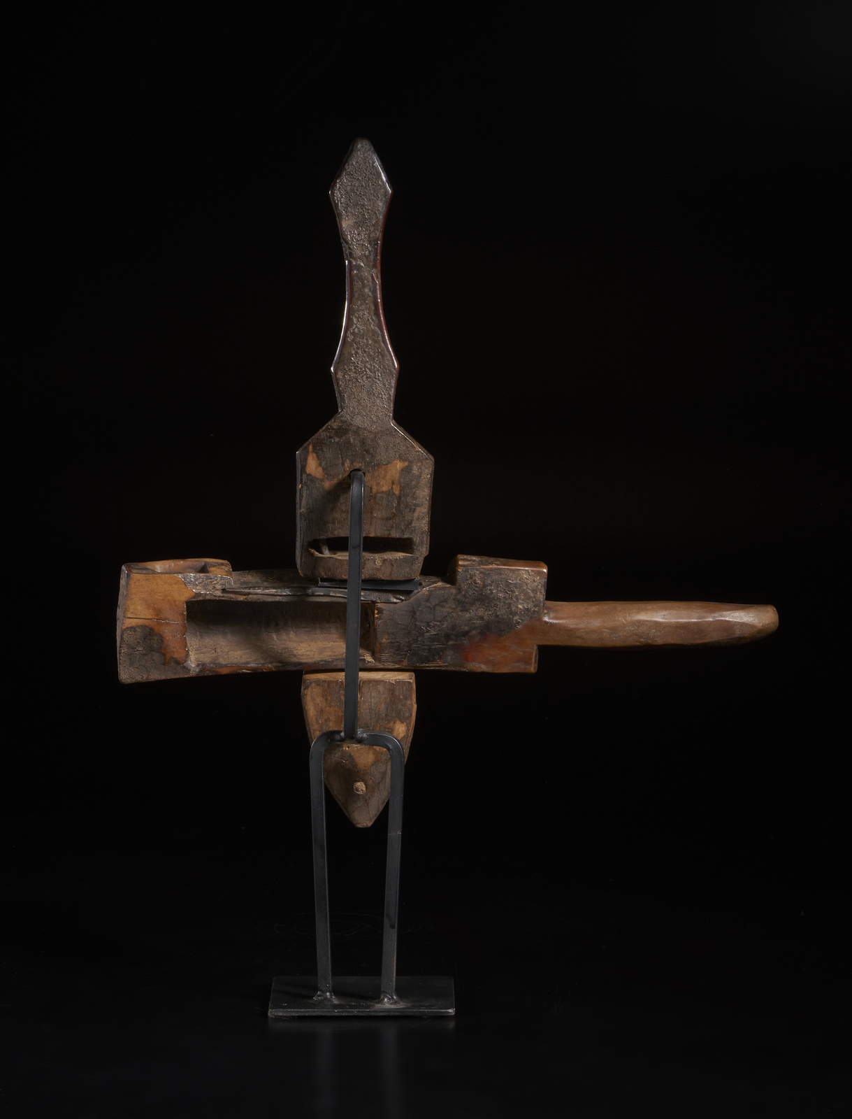 Segni d'uso. . Cm 41,00 x 42,00 x 6,00. Bella serratura in Bambara utilizzata sulle porte dei fienili del Mali, di buone dimensioni e caratterizzata nella parte superiore dalla figura sapientemente stilizzata di un coccodrillo.