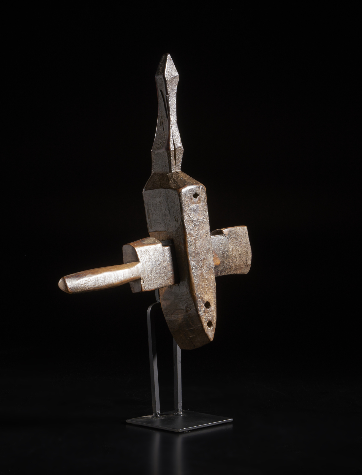 Arte africana - Bambara, Mali. Serratura per porta di granaio. Legno duro a patina scura e metallo. Segni d'uso.