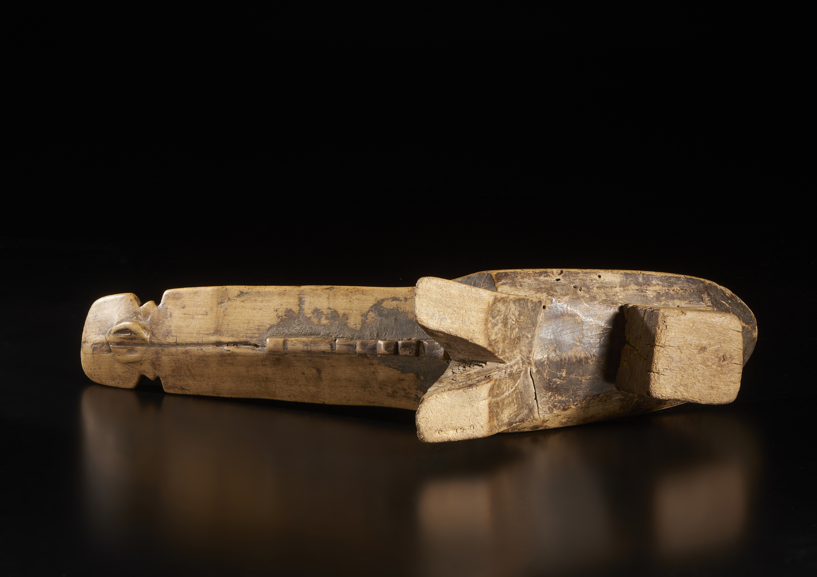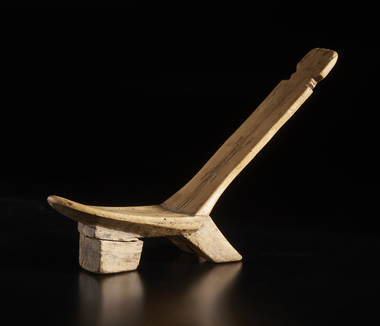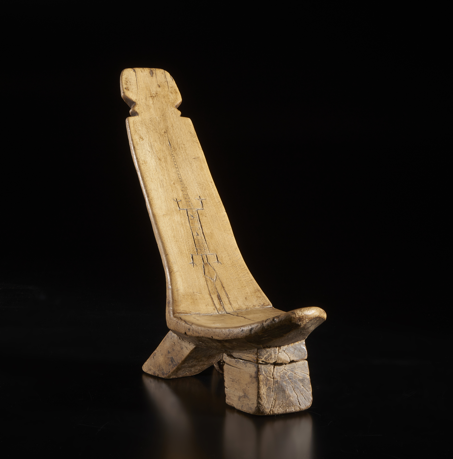 . . Cm 53,00 x 33,00. Seggio da dignitario scolpito in un unico blocco di legno secondo gli stilemi caratteristici Lobi ed inciso sulla seduta con la figura stilizzata di un rettile