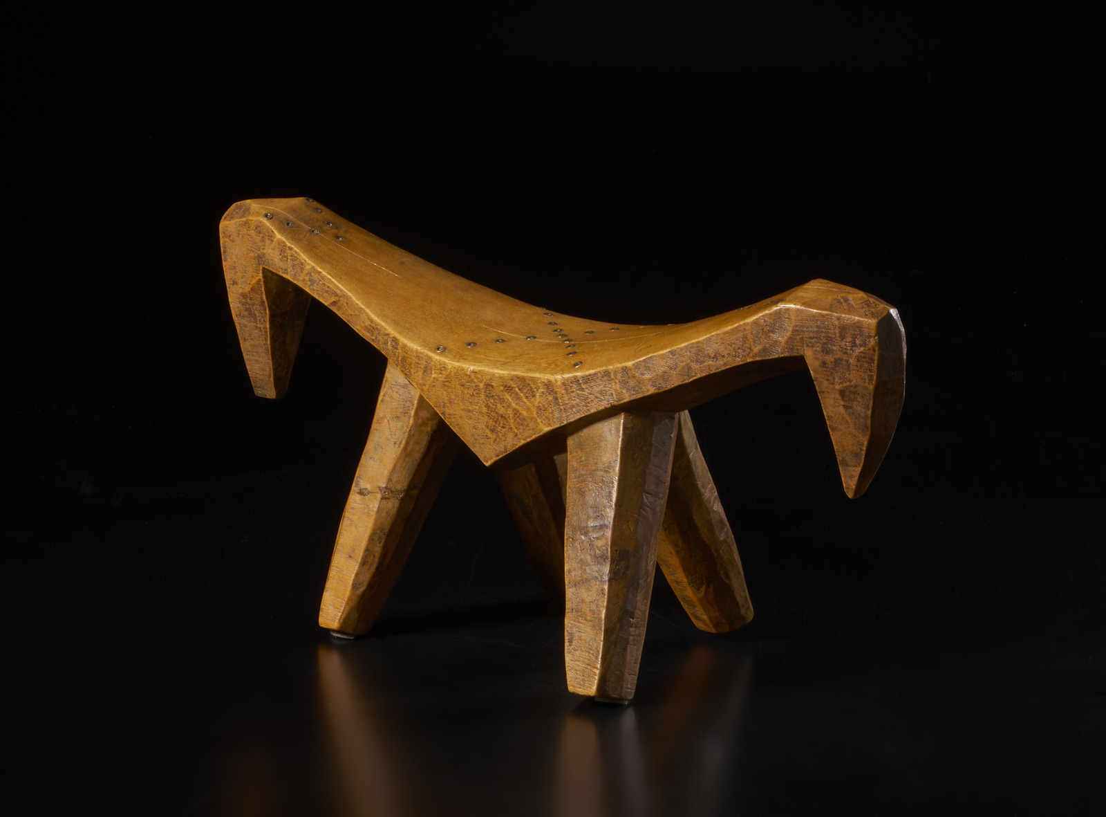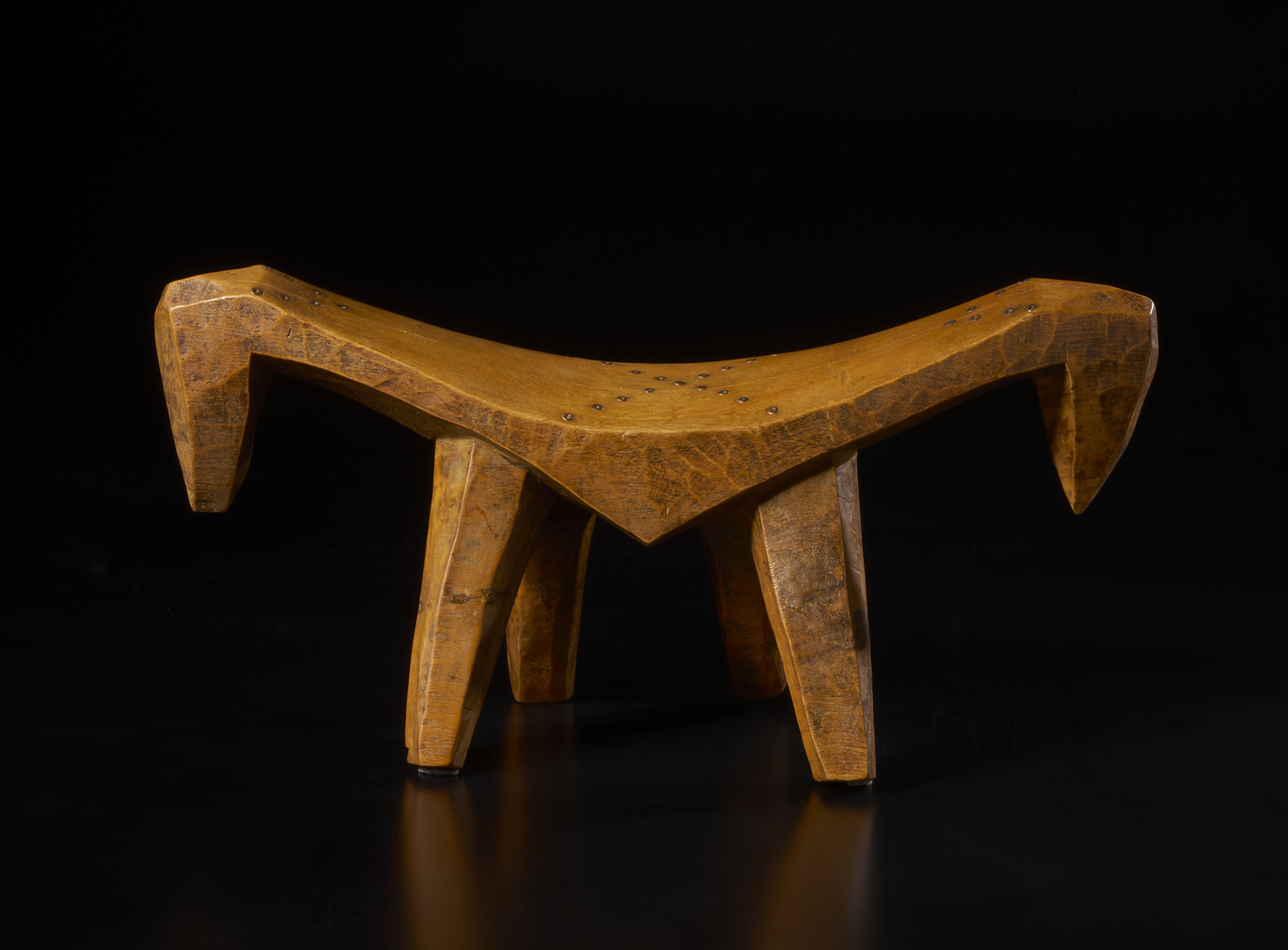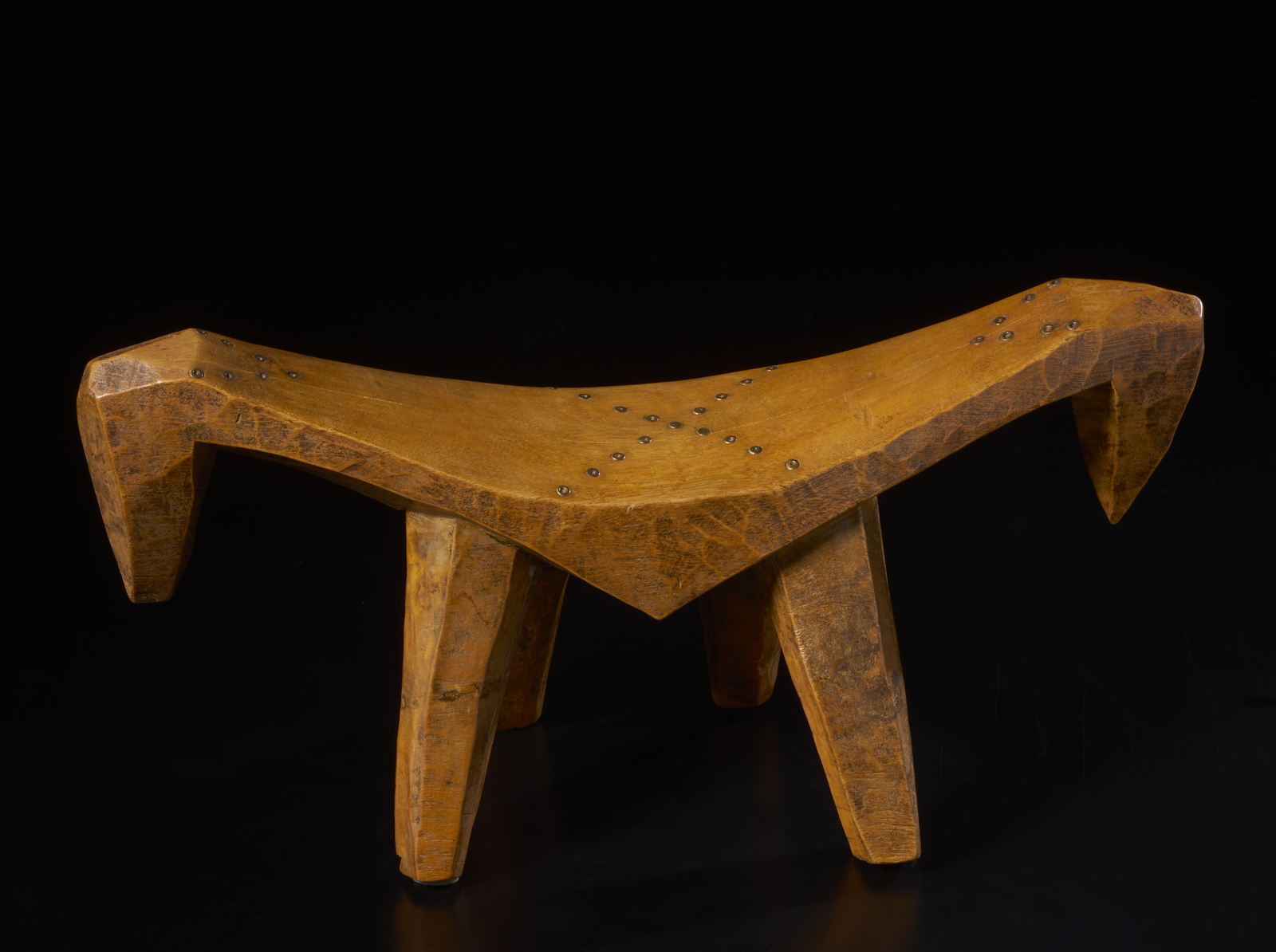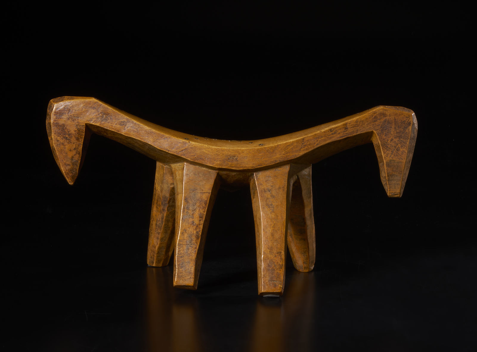 Segni d'uso. . Cm 46,00 x 23,50 x 20,00. Sgabello realizzato da un unico pezzo di legno, a quattro zampe e con due elementi decorativi alle sommità superiori, scolpiti in forma di teste stilizzate zoomorfe.