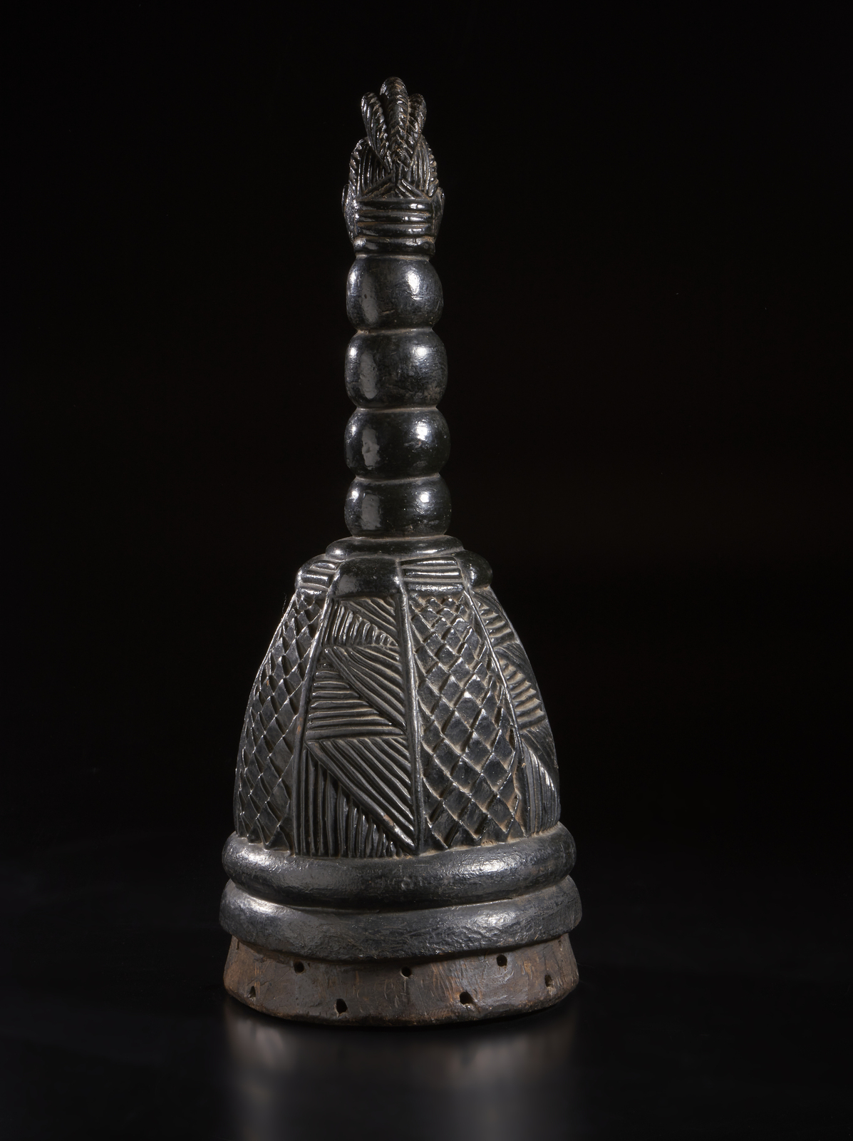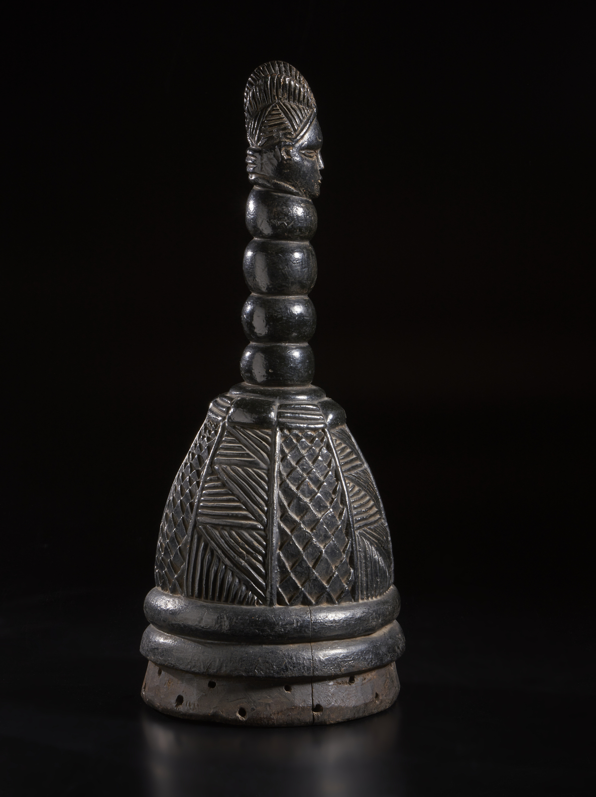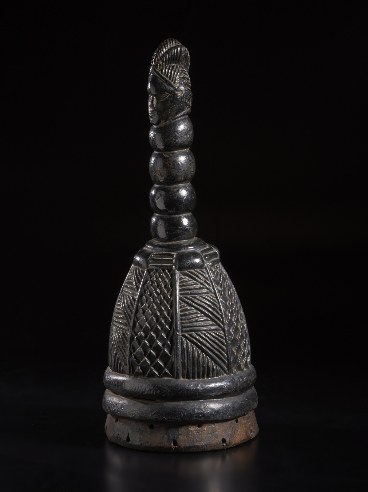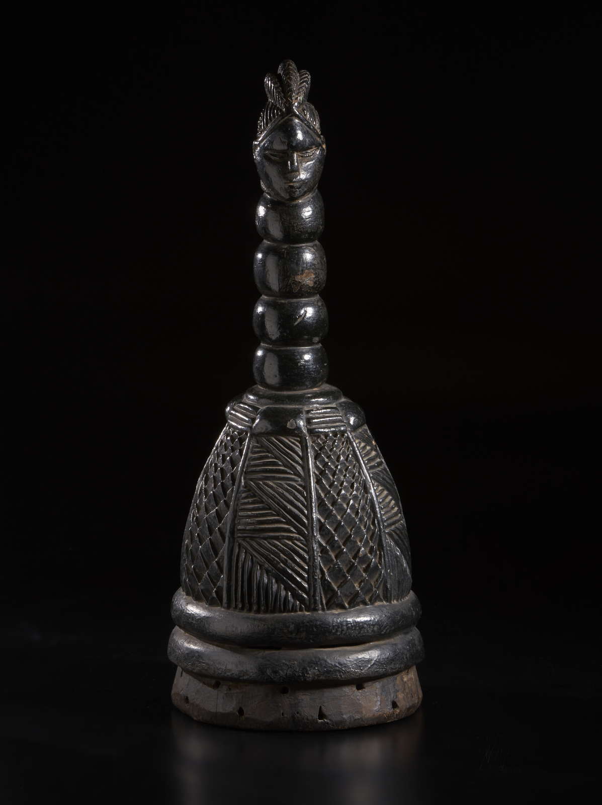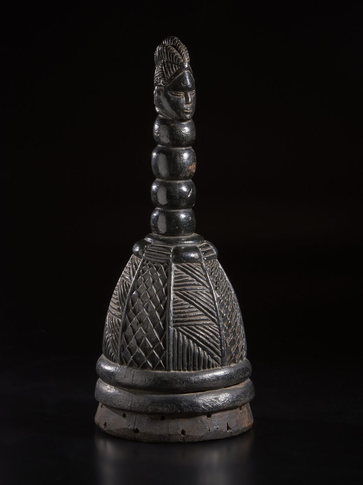 La parte superiore del casco, di evidente forma fallica ed utilizzato con ogni probabilità durante i riti per spiegare visivamente alle giovani donne i principi basilari dell'educazione sessuale, è caratterizzata dalla scultura a tutto tondo di una testina ben scolpita, proporzionata ed abbellita dalla consueta raffinata acconciatura, posizionata su un lungo collo a quattro rotoli di grasso.