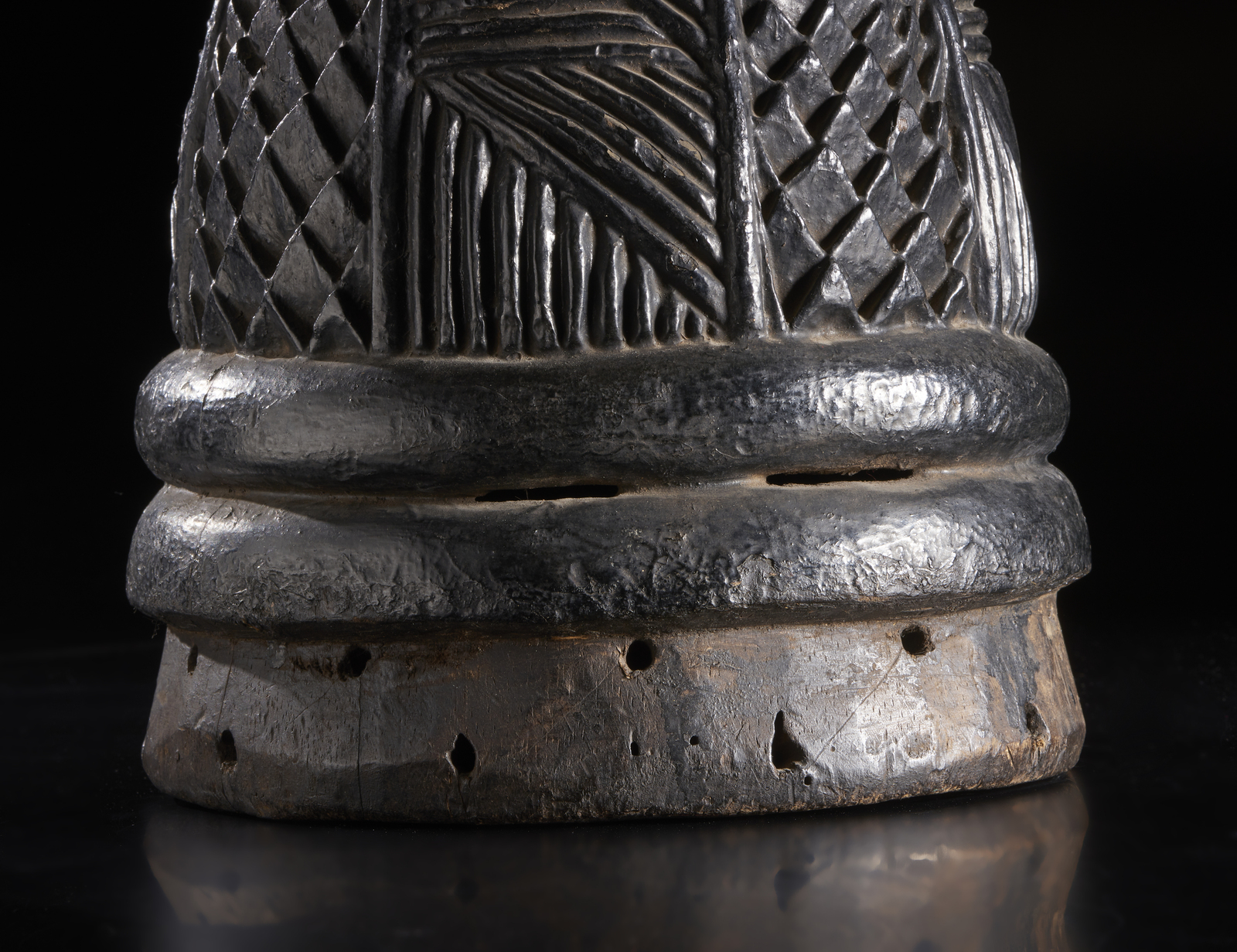 Realizzata in maniera atipica, questa particolare quanto rara maschera è composta dal casco scavato, lavorato e inciso a motivi geometrici che richiamano le elaborate acconciature delle donne Mende.