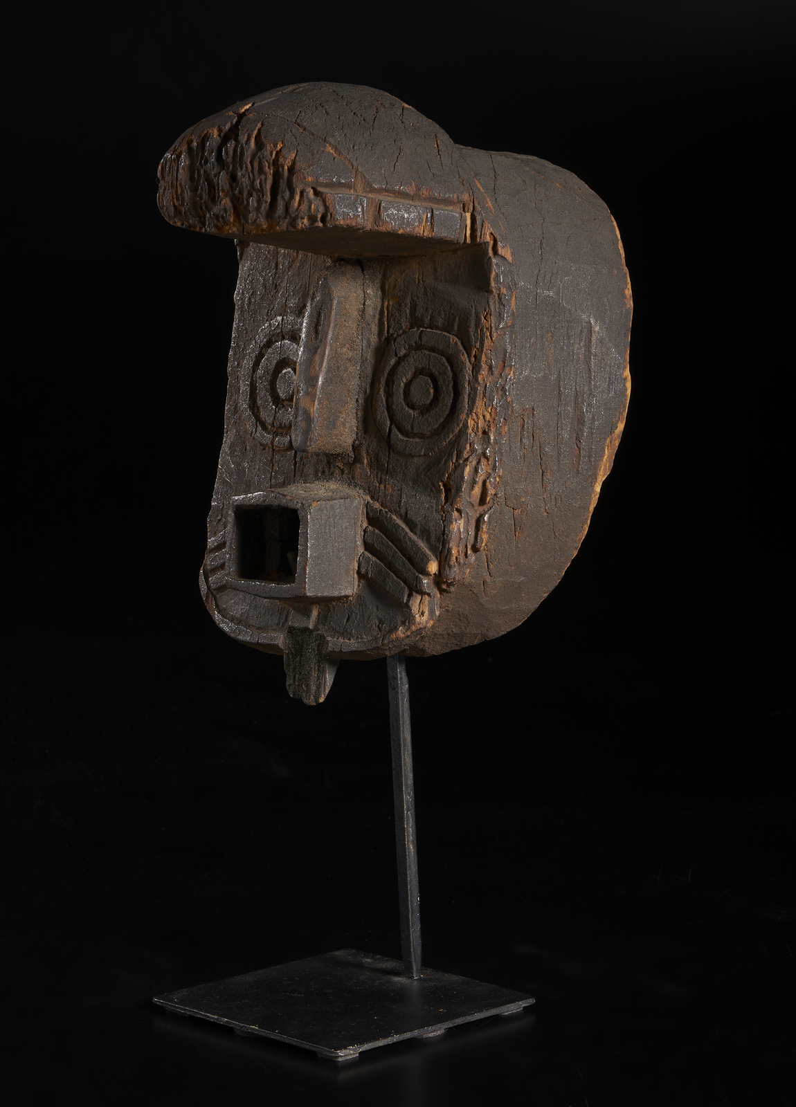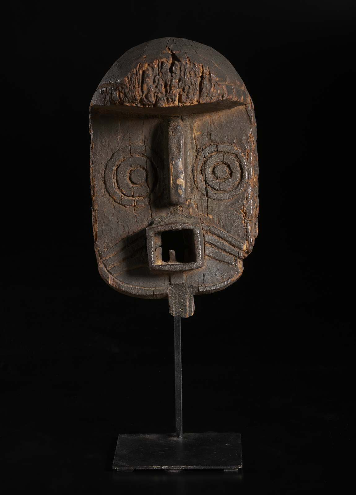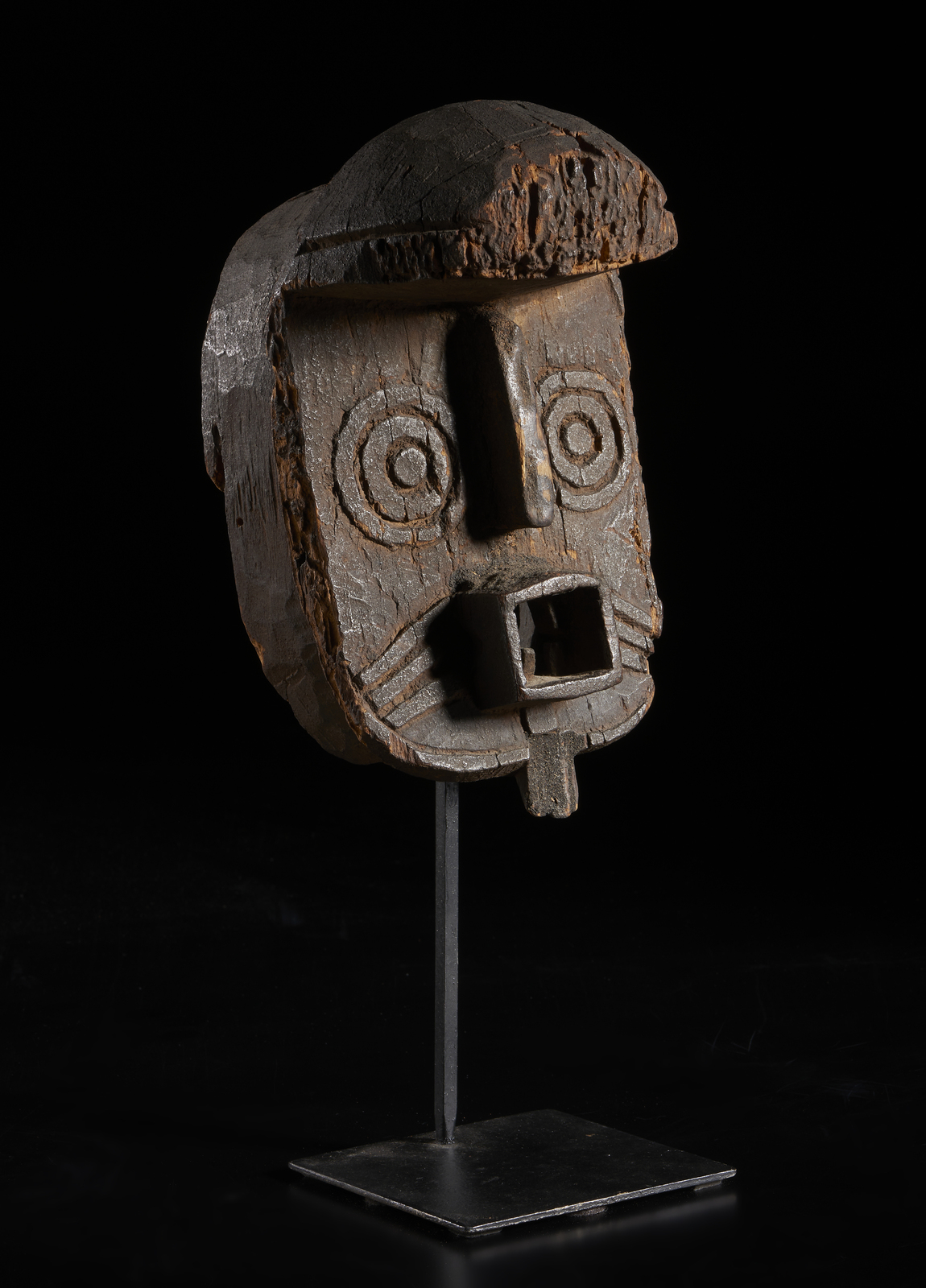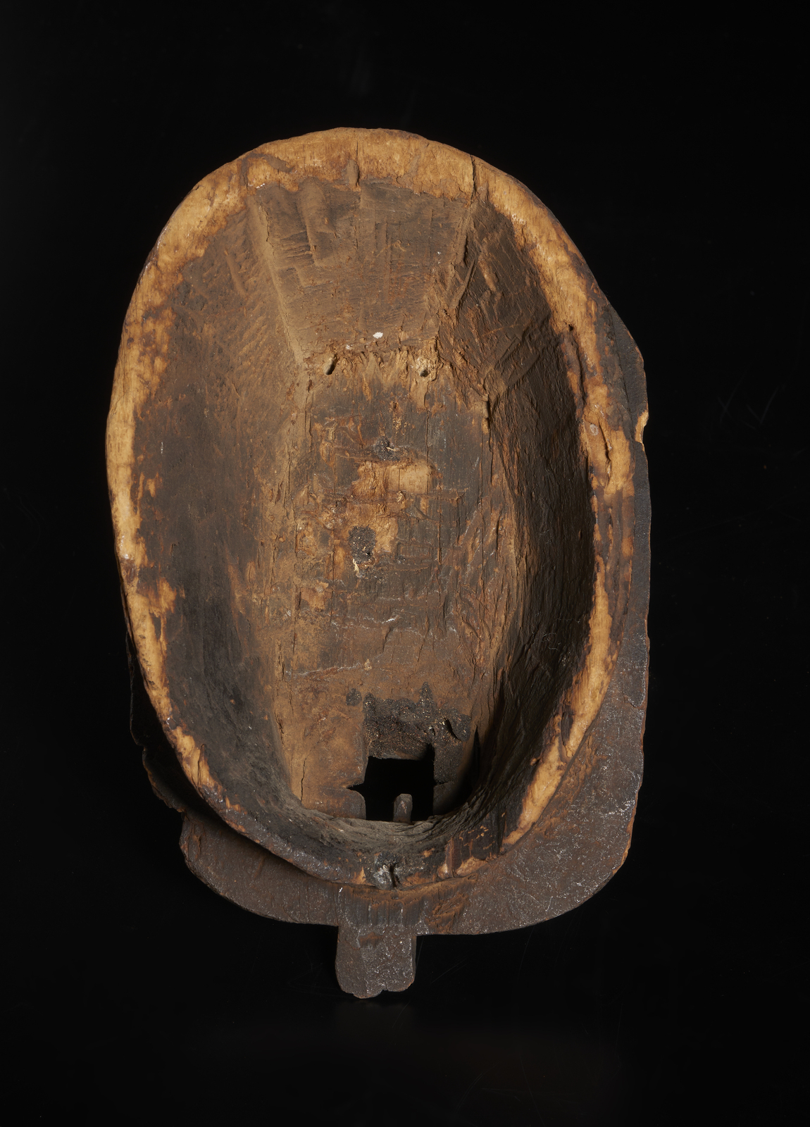 I diversi difetti visibili e la notevole patina crostosa derivante dalle numerose offerte ricevute nel tempo danno a questa maschera Wankr un aspetto particolarmente vecchio e vissuto.