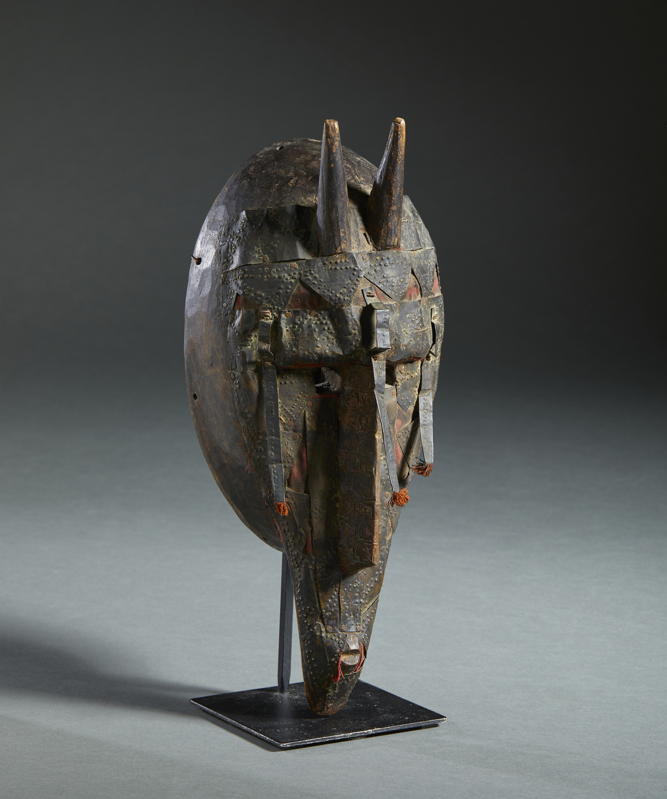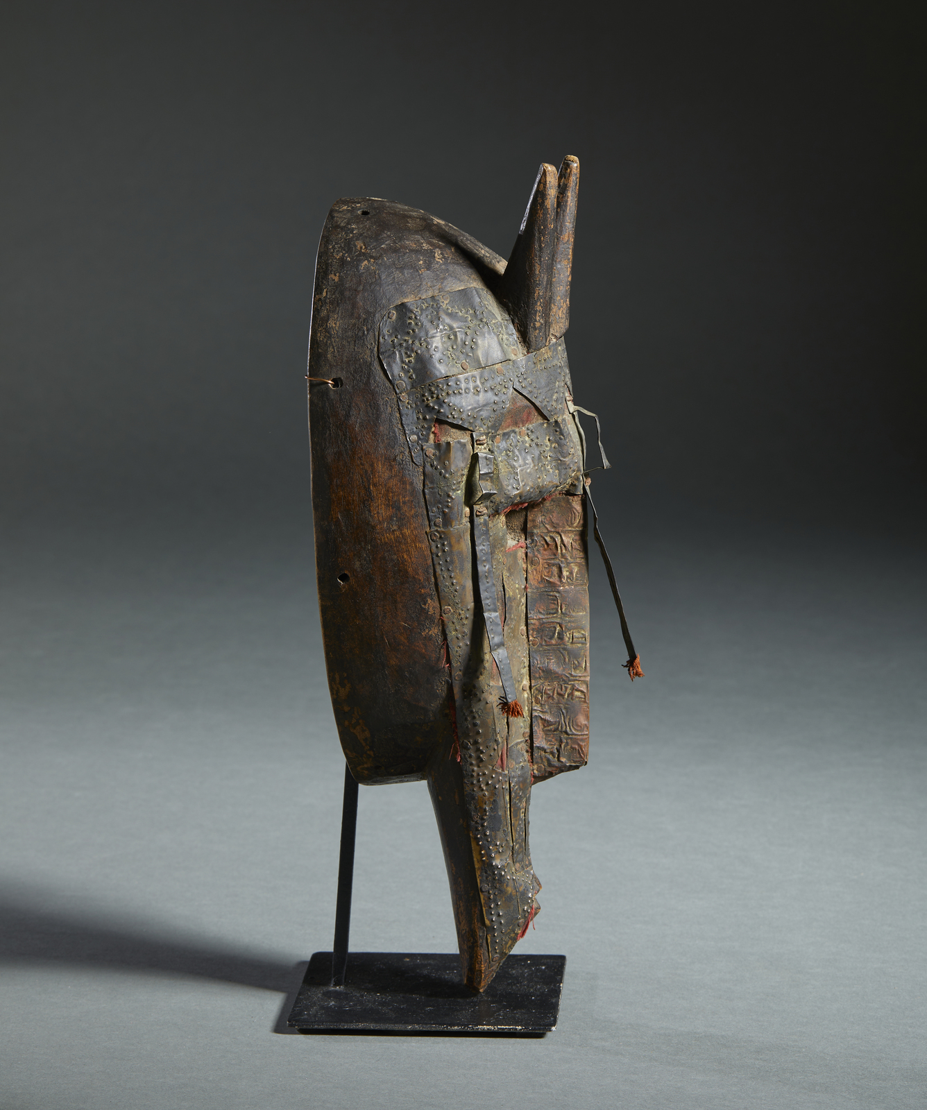Segni d'uso e tracce di sostanze organiche sacrificali. . . Cm 16,00 x 37,00 x 12,00. Rara maschera Ngolo parzialmente ricoperta da tessuto rosso e lamelle sagomate di metallo come nella classica tradizione scultorea delle maschere Marka.