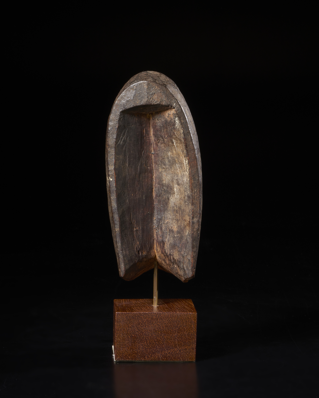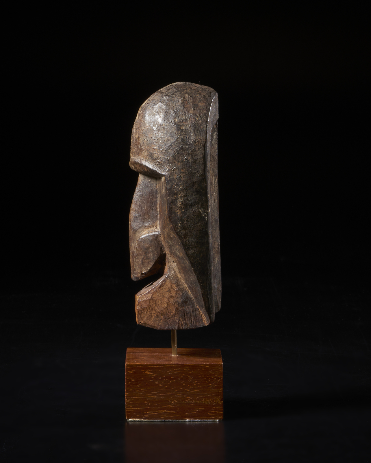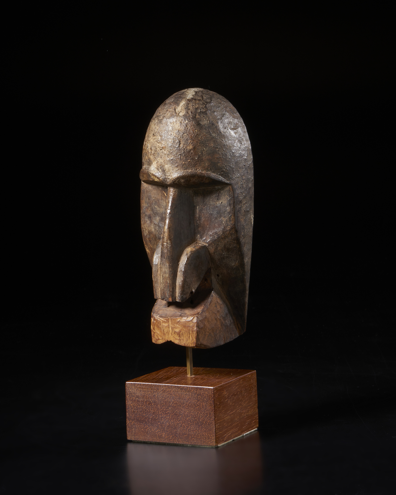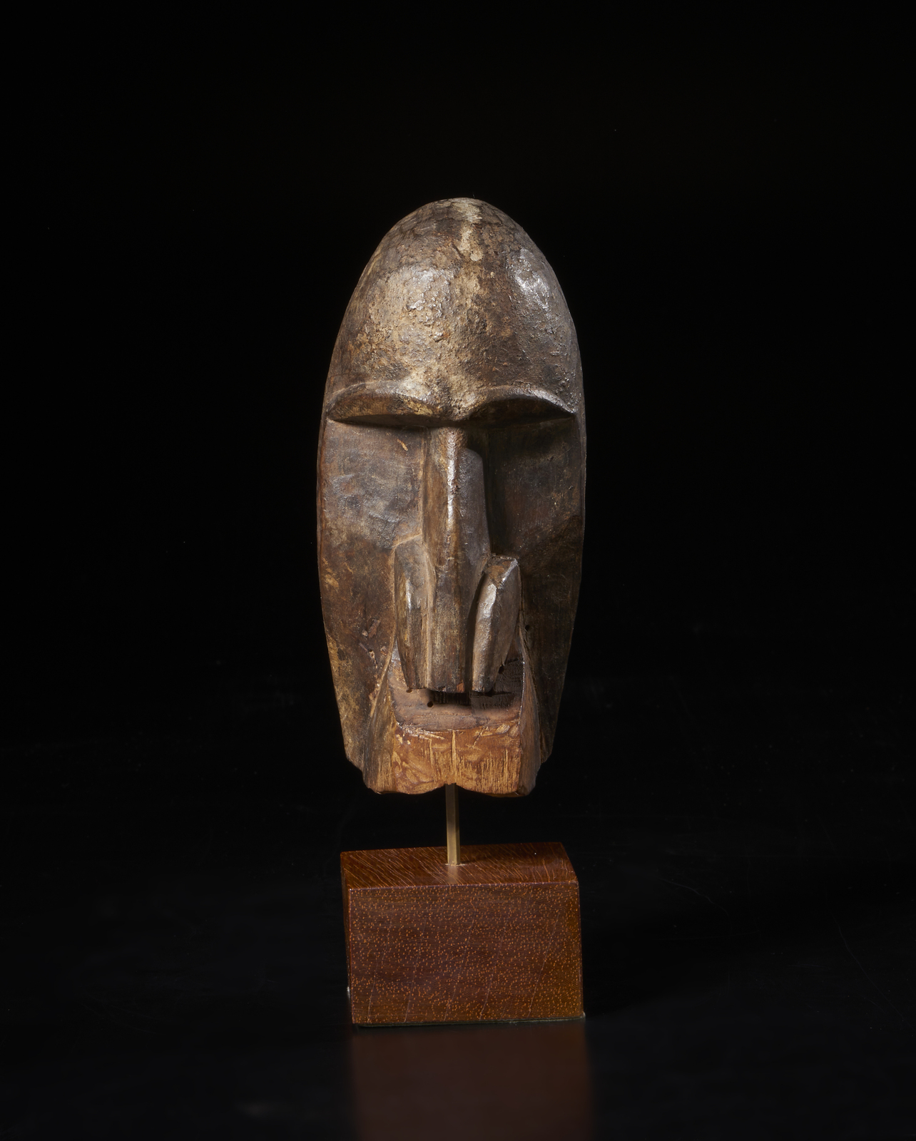 Provenienza: Ex. collezione Franco Monti. . . Cm 6,00 x 17,00 x 8,00. Maschera di piccola dimensione ma di notevole valore estetico artistico, a forma di volto umano caratterizzato da una fronte bombata, un naso prominente che cela alcuni fori sottostanti, probabilmente utilizzati in origine per fermare peli di scimmia (oggi mancanti) che ricadevano sulla bocca quadrangolare. Quest'ultima potrebbe esser stata scolpita in origine a forma di becco di tucano come nelle maschere maschili Gagon dei Dan. In accordo con quanto descritto da Ezio Bassani sulla scheda di una maschera molto simile in collezione delle Raccolte extraeuropee del Castello Sforzesco di Milano, per essere attribuita con certezza all'etnia Kpelle ( o Guerzè, uno dei 140 soprannomi dati a questo popolo della Guinea), questa maschera dovrebbe avere occhi tubolari circolari, mentre nelle maschere dello stesso tipo dei vicini Dan dovrebbero essere a fessura. Risulta pertanto difficile dare una zona di provenienza certa a questa maschera, dato che sebbene siano ben evidenziate le arcate sopraccigliari, gli occhi non sono neanche accennati. Per uscire dal dilemma prendo ancora in prestito le parole di Bassani che sempre nella stessa scheda propone: "E' possibile che l'iconografia delle maschere Kpelle derivi dalla sovrapposizione di elementi delle maschere Gagon dei Dan e di altri derivanti dalle maschere Landau dei Toma della Liberia"