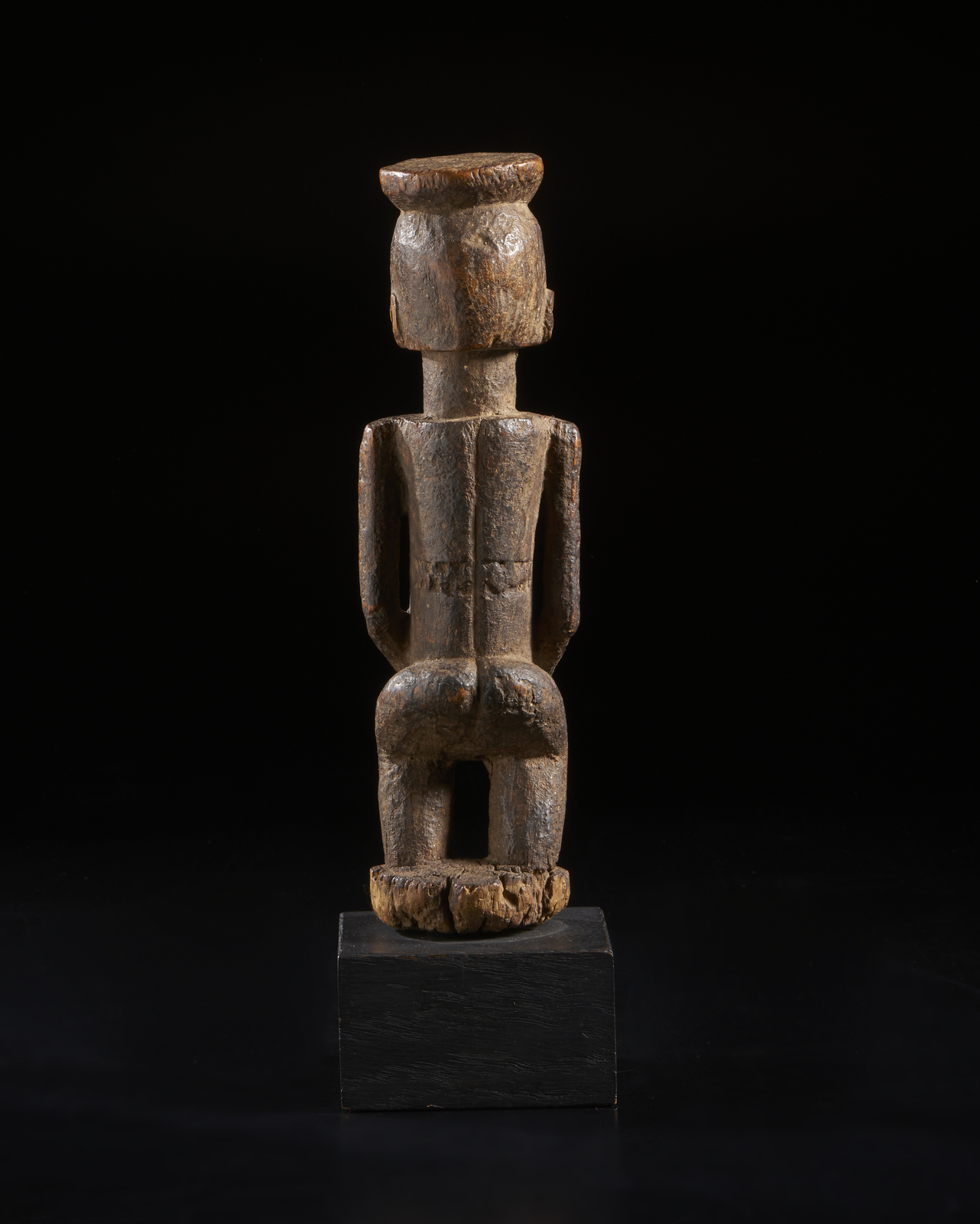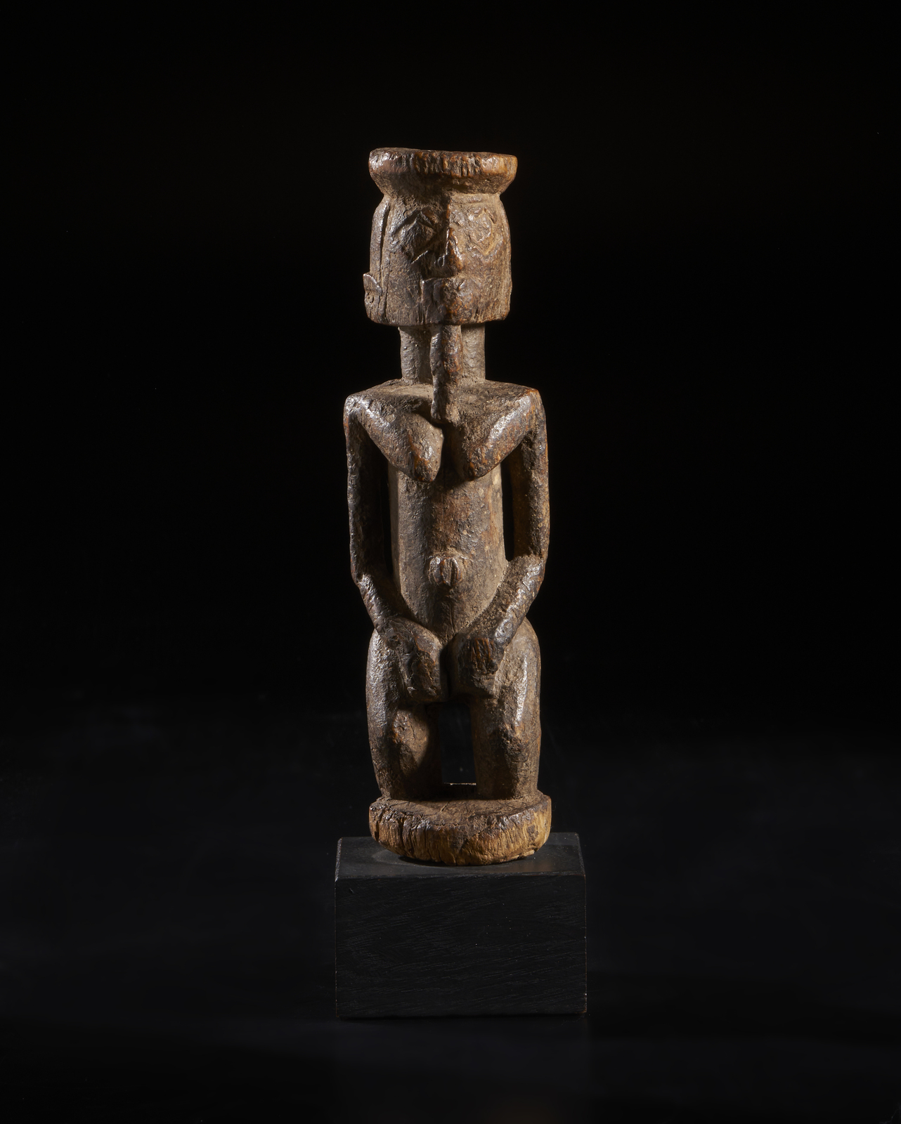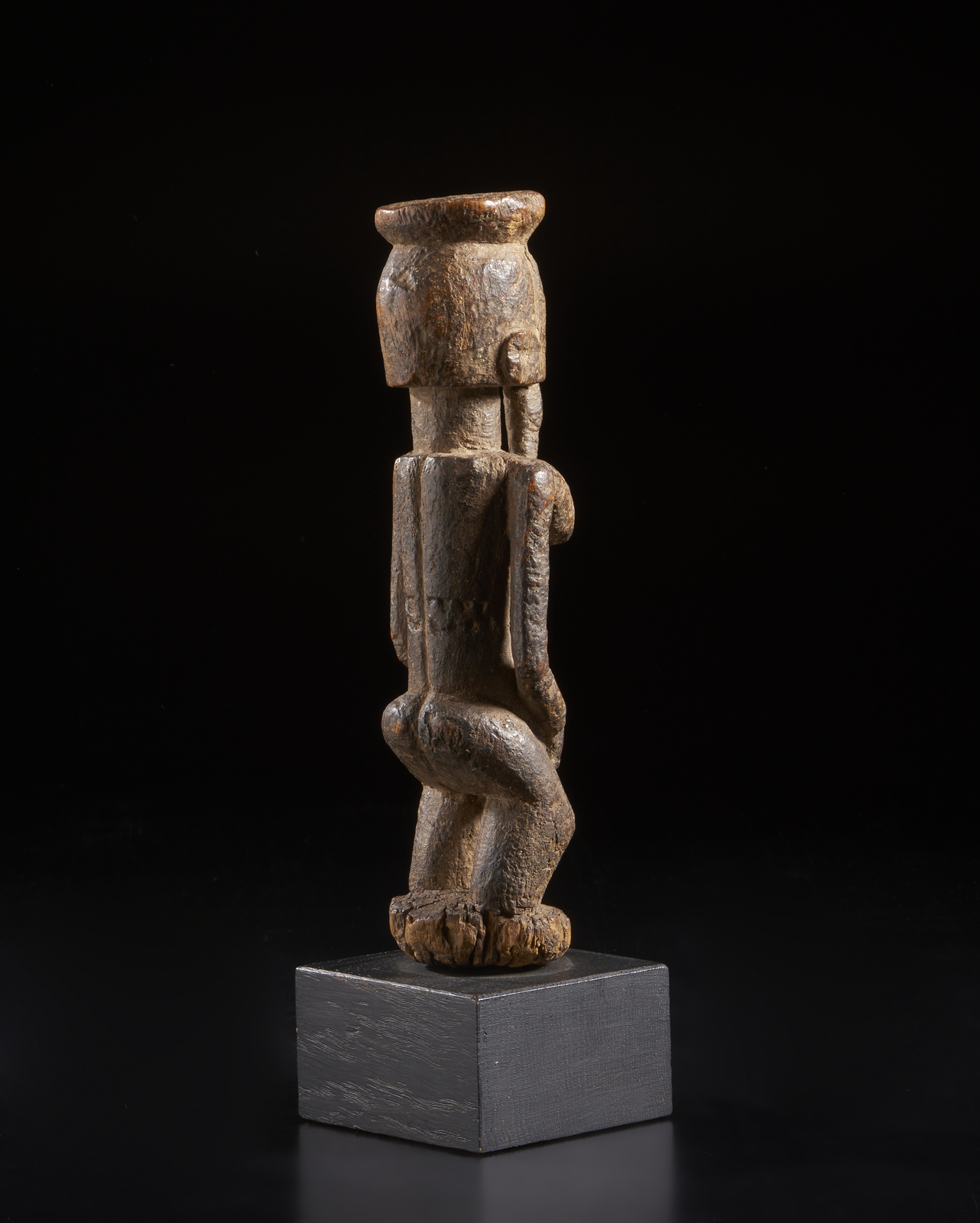 Segni d'uso. . . Cm 5,50 x 21,70 x 6,00. Questa bella figura Bambou-toro racchiude in se il concentrato di tutte le qualità estetiche e artistiche magistralmente espresse dalla grande scultura classica dei Dogon. Bella per qualità d'intaglio, proporzione dei volumi e per le soluzioni plastiche adottate dallo scultore (si noti l'intera composizione del volto con gli occhi quadrangolari e l'armoniosa disposizione delle braccia). Bella anche per la sorprendente semplicità dell'unica scarificazione dorsale presente, a parere del Dott. Bebbe Berna evocante il "cammino dell'acqua-parola", e per la patina crostosa derivante dalle numerose offerte devozionali ricevute nel tempo. Bella, infine, per l'usura, la consunzione e i molteplici segni d'uso presenti che danno chiara testimonianza dell'antichità di quest'oggetto.