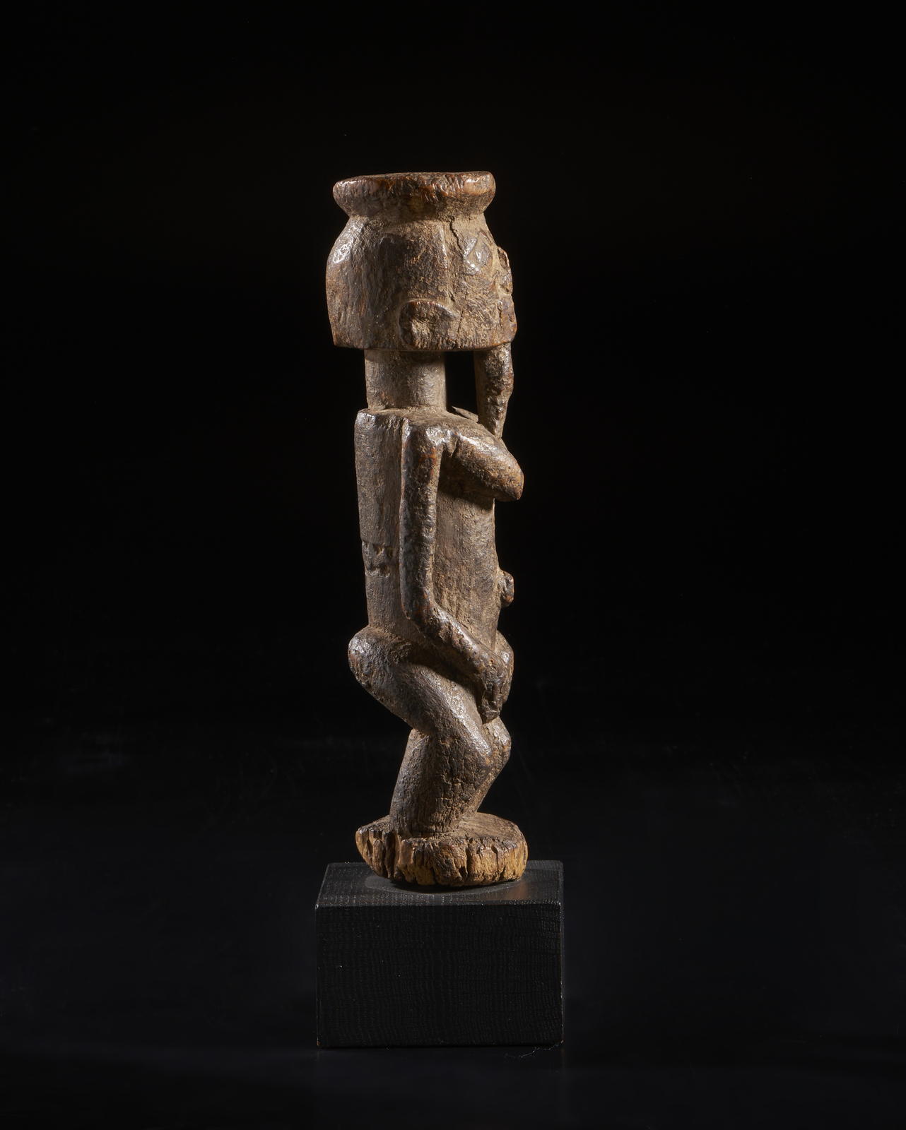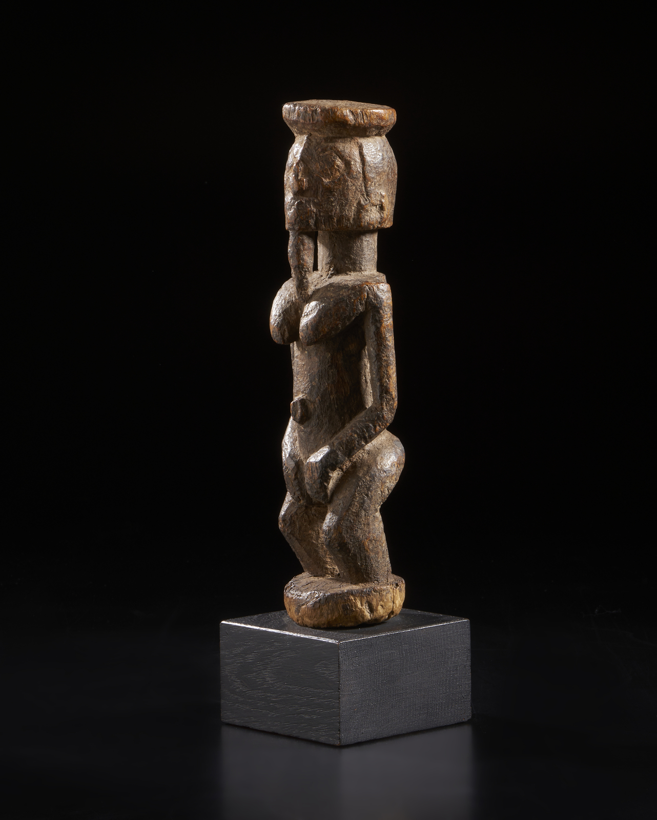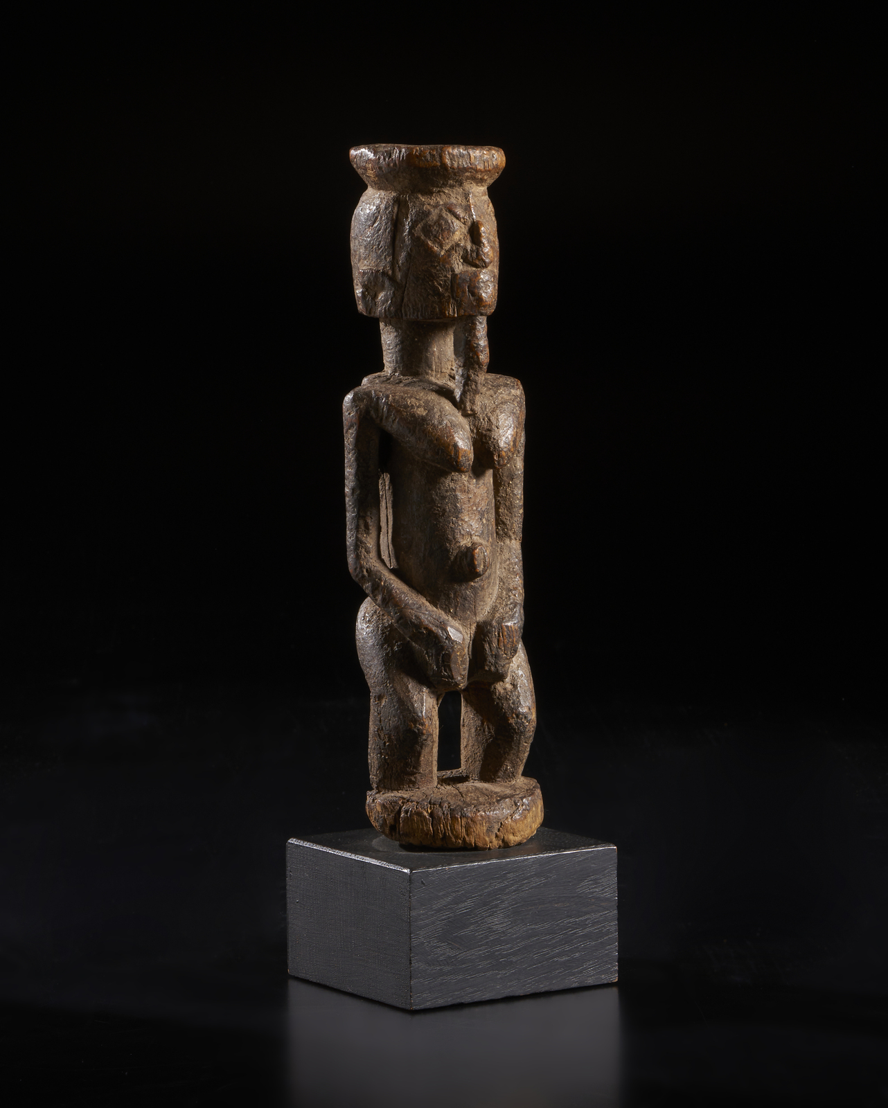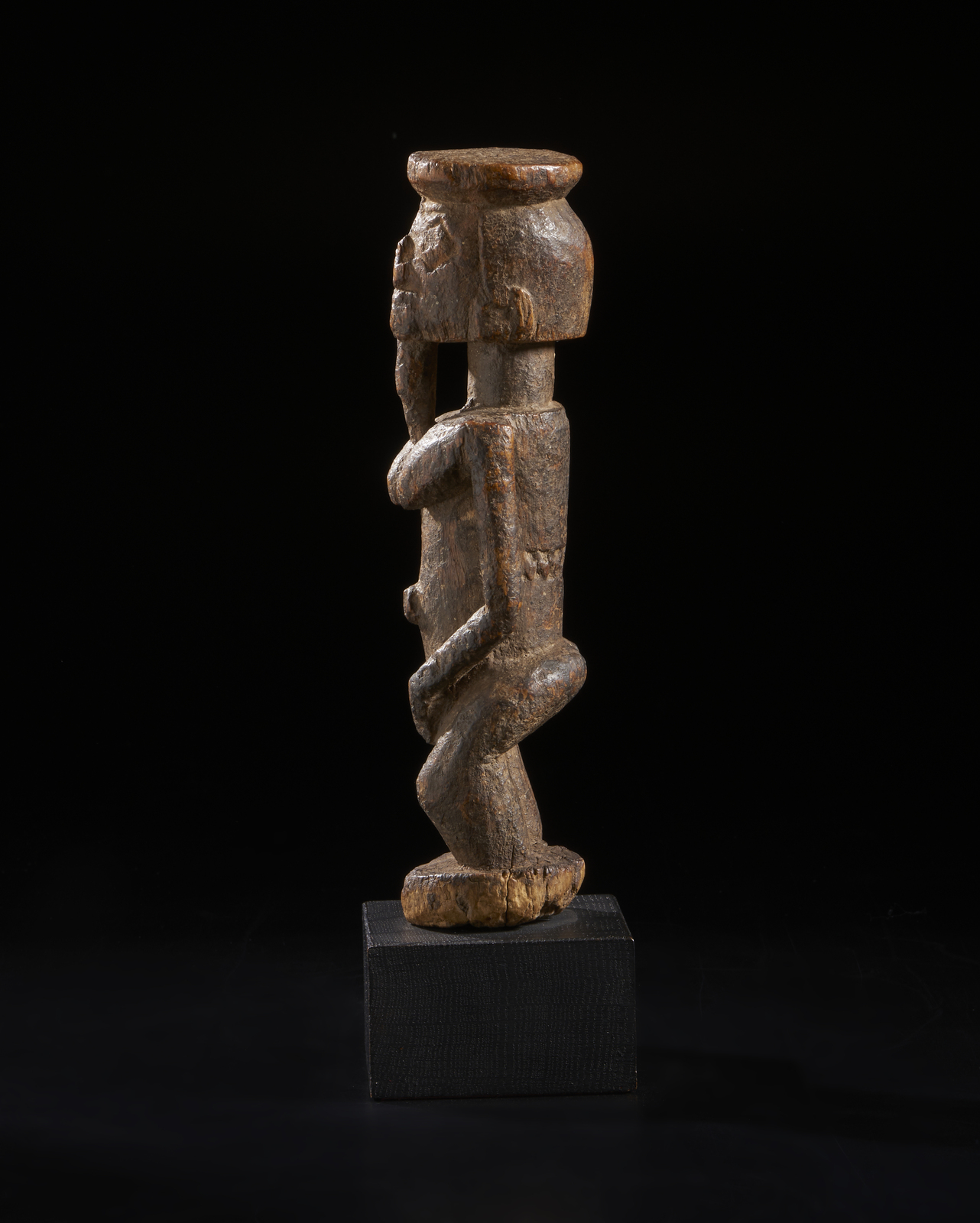 Segni d'uso. . . Cm 5,50 x 21,70 x 6,00. Questa bella figura Bambou-toro racchiude in se il concentrato di tutte le qualità estetiche e artistiche magistralmente espresse dalla grande scultura classica dei Dogon. Bella per qualità d'intaglio, proporzione dei volumi e per le soluzioni plastiche adottate dallo scultore (si noti l'intera composizione del volto con gli occhi quadrangolari e l'armoniosa disposizione delle braccia). Bella anche per la sorprendente semplicità dell'unica scarificazione dorsale presente, a parere del Dott. Bebbe Berna evocante il "cammino dell'acqua-parola", e per la patina crostosa derivante dalle numerose offerte devozionali ricevute nel tempo. Bella, infine, per l'usura, la consunzione e i molteplici segni d'uso presenti che danno chiara testimonianza dell'antichità di quest'oggetto.