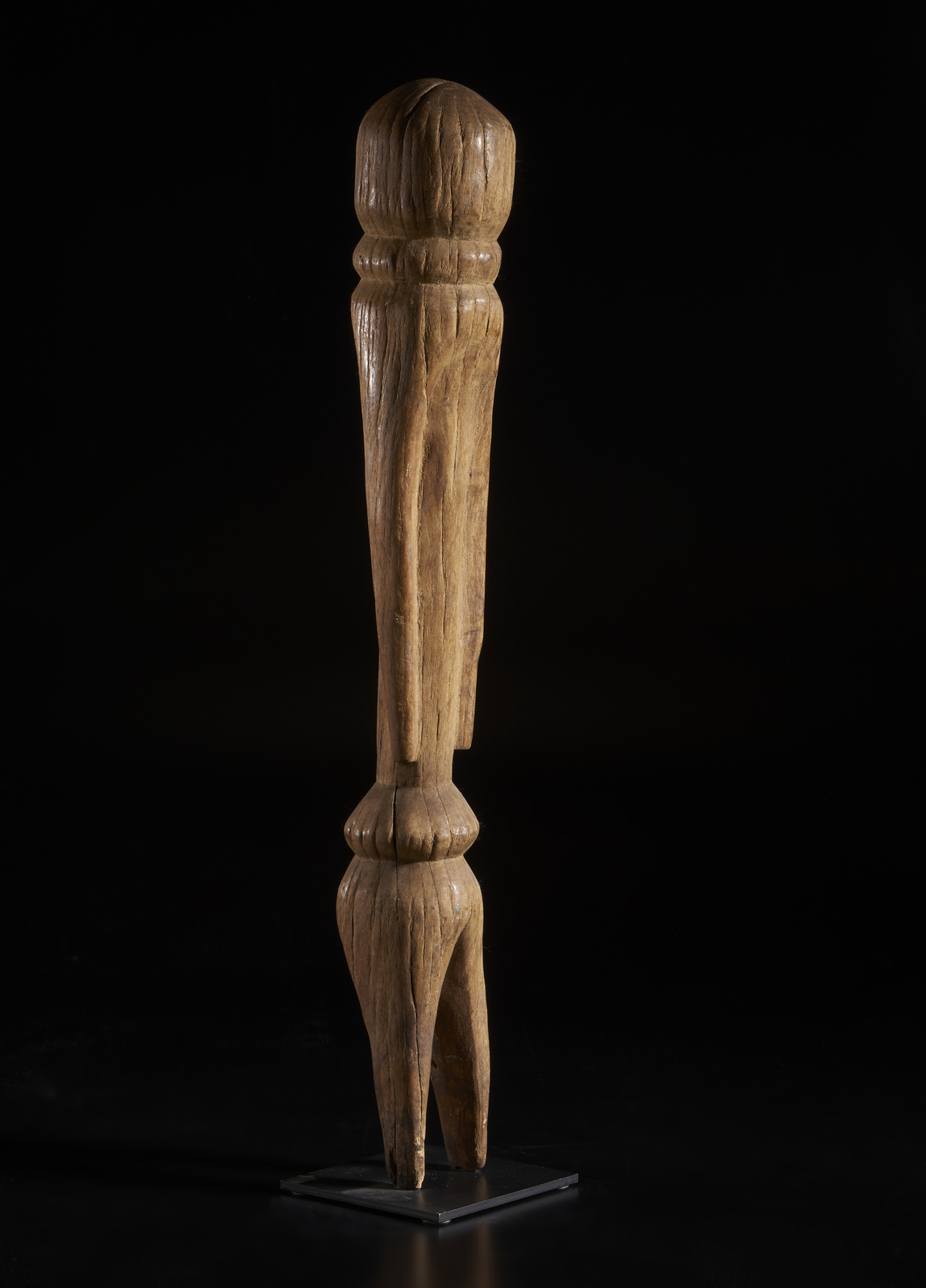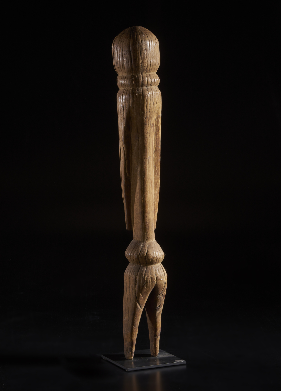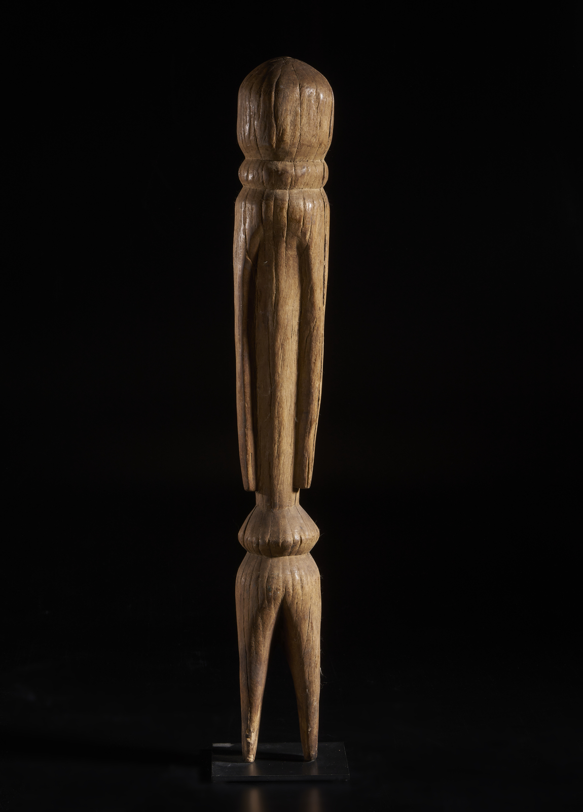 Consunzioni e segni d'uso. . Cm 9,50 x 77,40. Prescritte dai divinatori del nord del Togo per innalzare il potere e la protezione di singoli, famiglie o interi villaggi, queste sculture altamente stilizzate realizzate da un unico blocco di legno, descrivono la figura antropomorfa con pochi volumi e tratti sintetici: testa tondeggiante senza alcun accenno al volto, collo e bacino ad anello, braccia sgrossate dal torso e gambe separate. Nessuna concessione al particolare descrittivo, solo sintesi.
