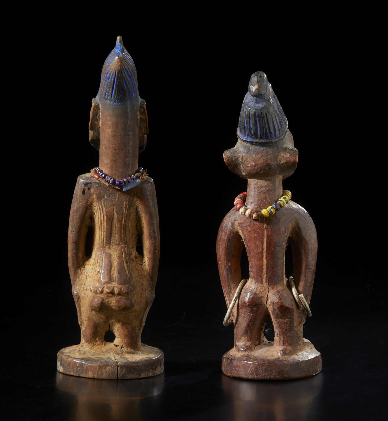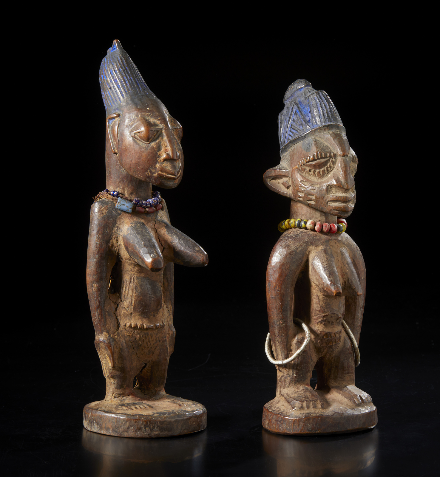 . . Cm 9,00 x 28,50. Lotto composta da due singoli gemelli Ibeji femminili di diversa provenienza geografica, qualità d'intaglio ed epoca.