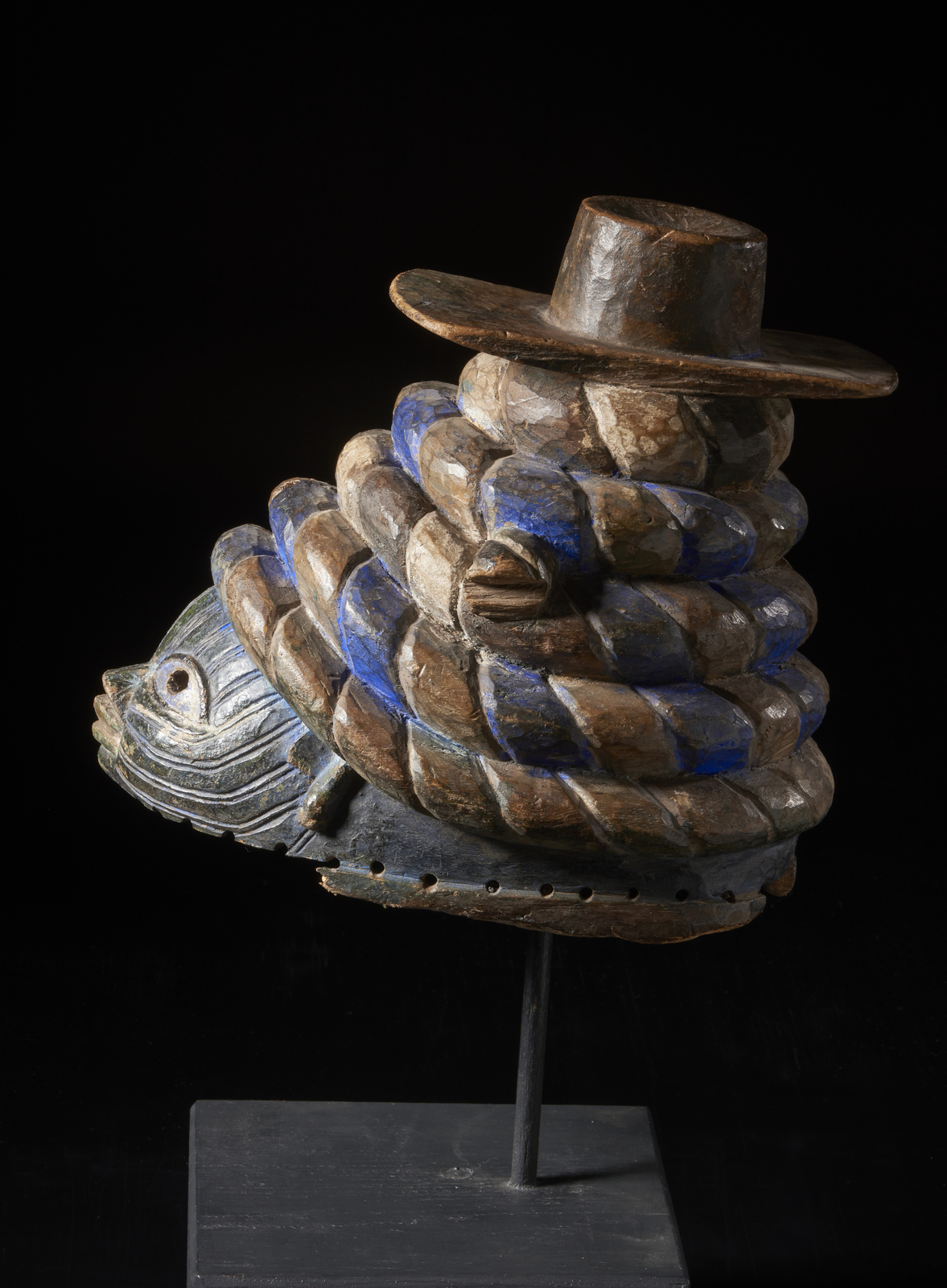 Questa maschera Gelede, di grande qualità artistica, dal volto armoniosamente scolpito, ben proporzionato e caratterizzato da numerose ed importanti scarificazioni, ci racconta con un certo umorismo, di un pitone comodamente acciambellato tra la testa di un'anziana signora ed il suo cappello, mentre lei lo guarda divertita.