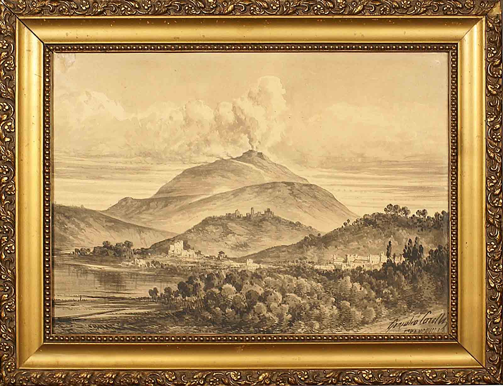 Consalvo Carelli (Napoli 1818 - 1900), "Veduta dell'Etna da Francavilla", tempera su carta, cm. 25x34, firmato e localizzato in basso a destra.