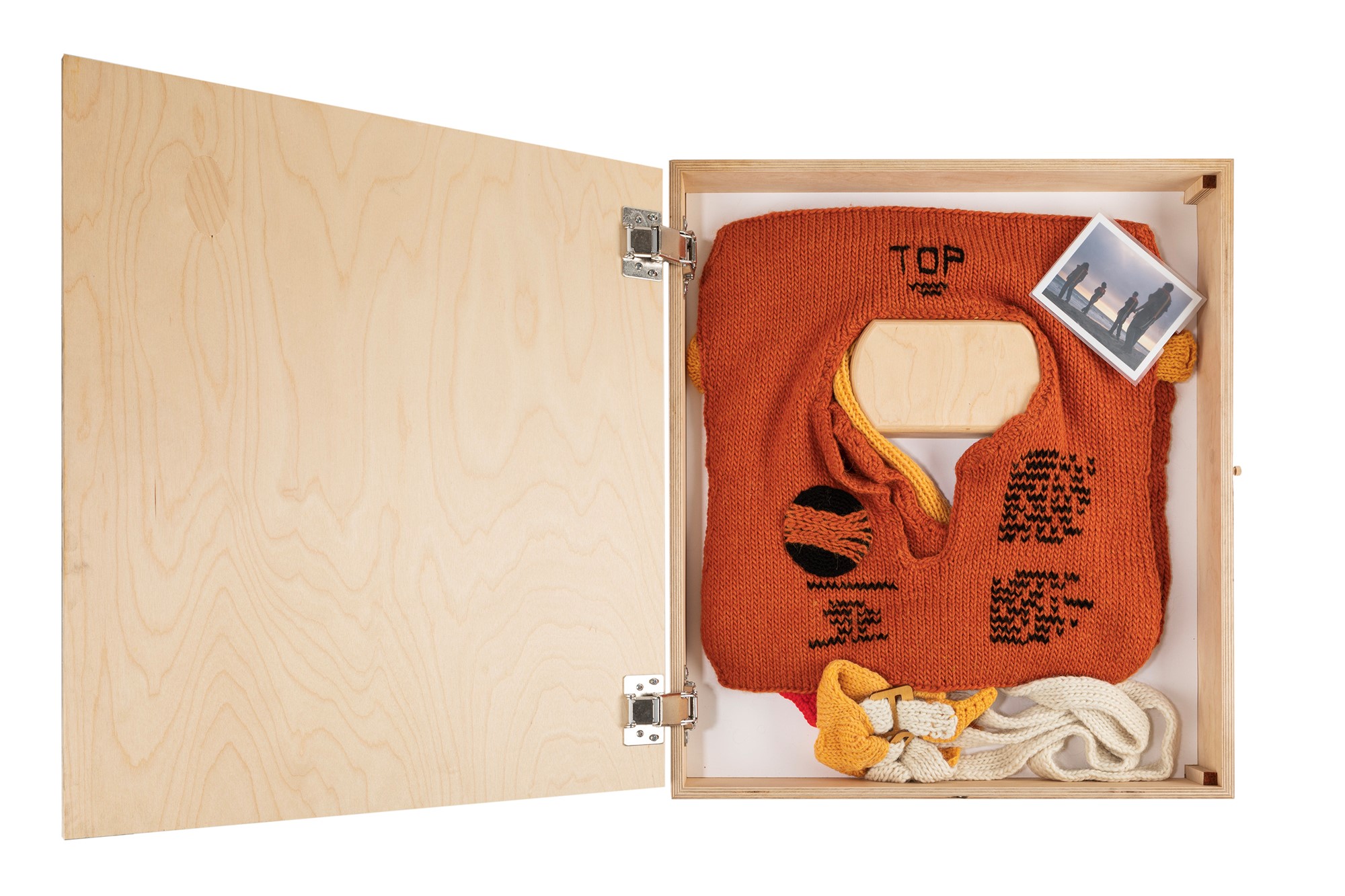 tecnica mista (giubbotto di salvataggio realizzato a maglia, lana, legno, 04 fotografie), es. di 40