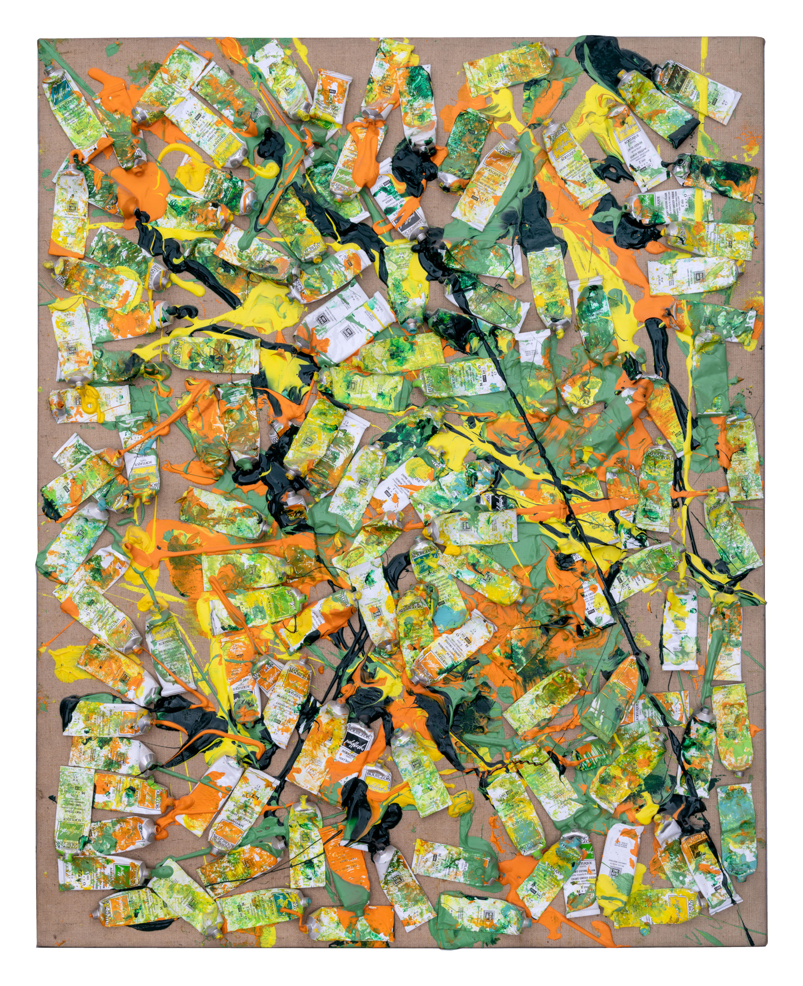 Accumulazione di tubetti di vernice e vernice acrilica su tela