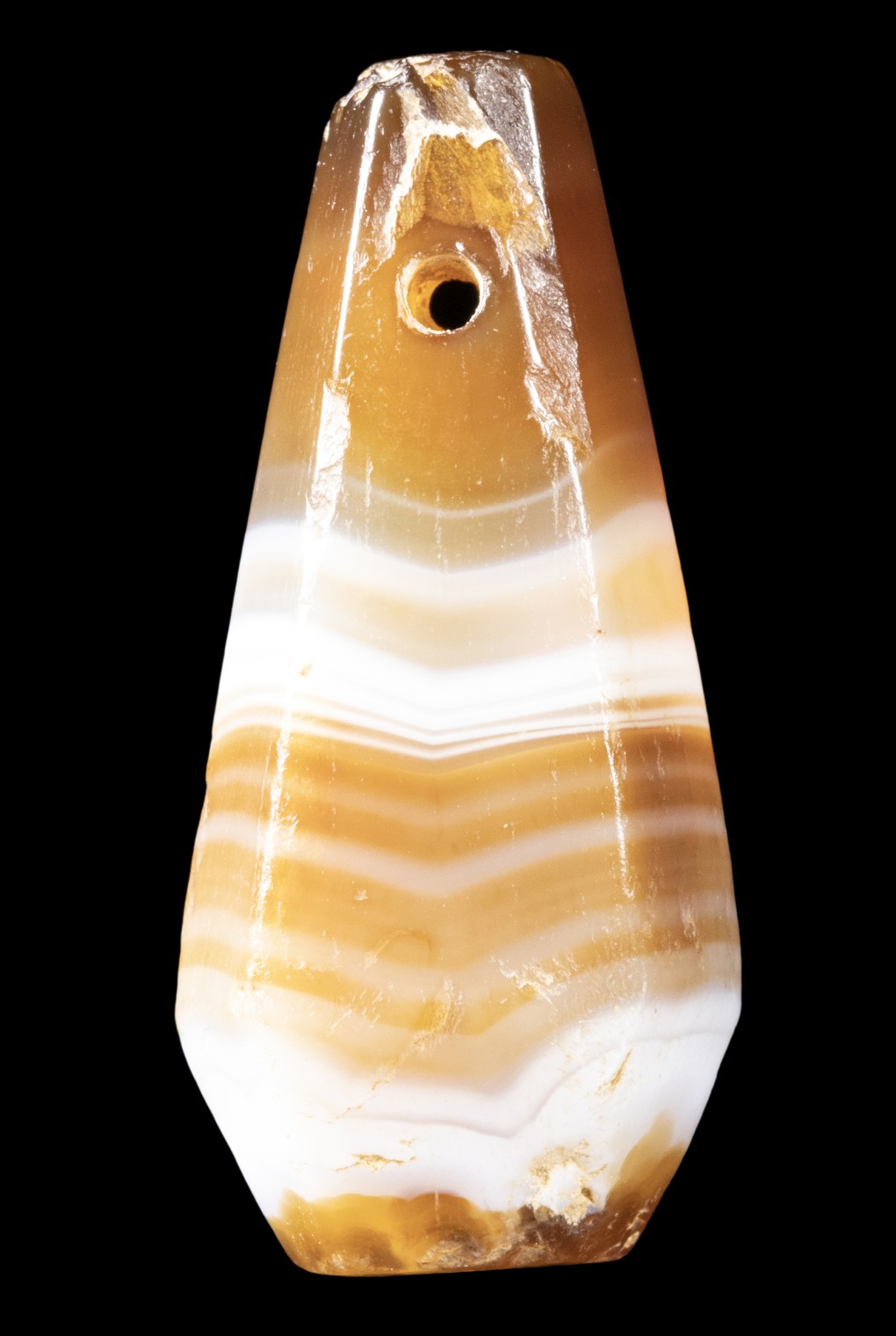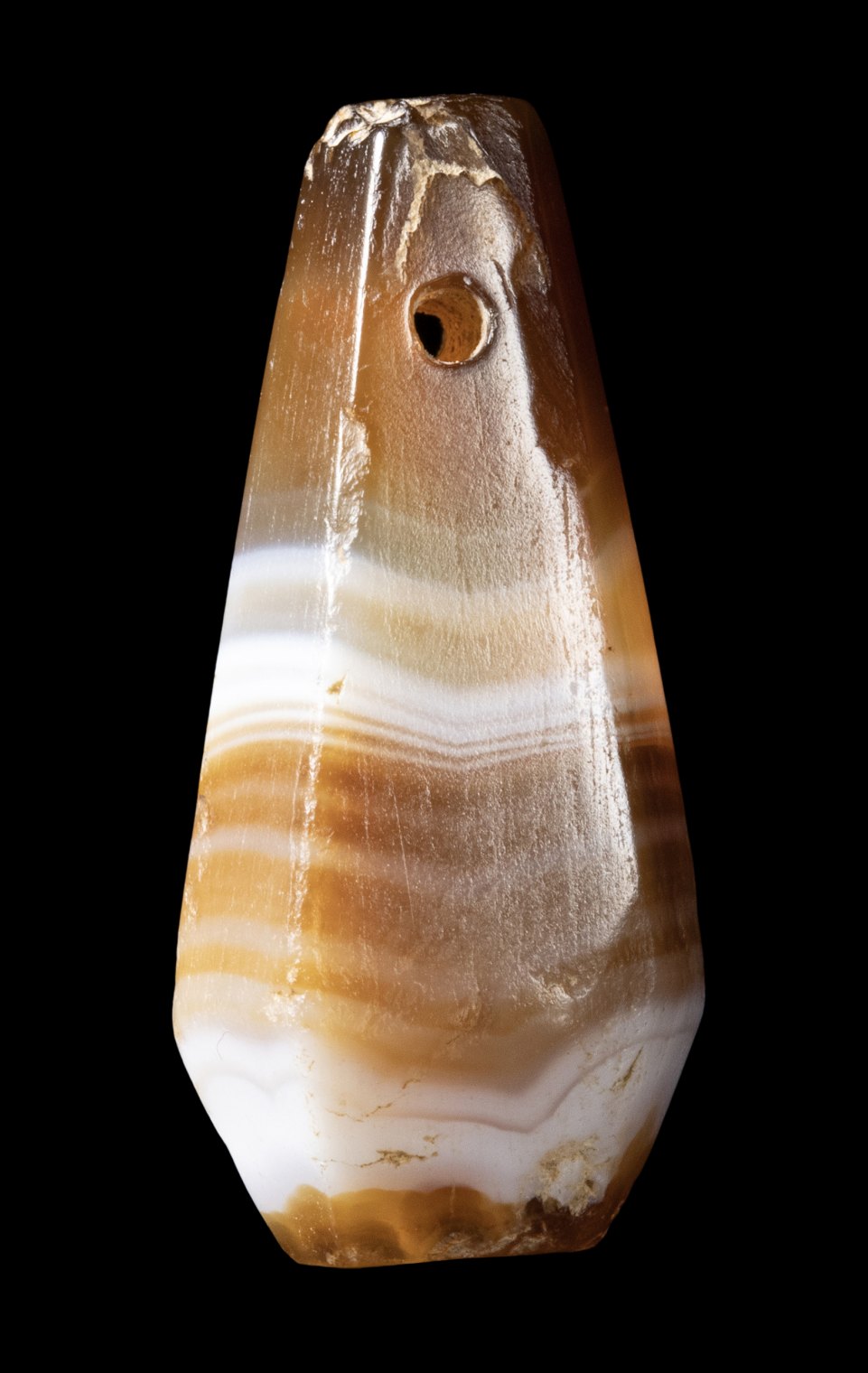 A NEAR EASTERN BANDED AGATE BEAD PENDANT.