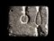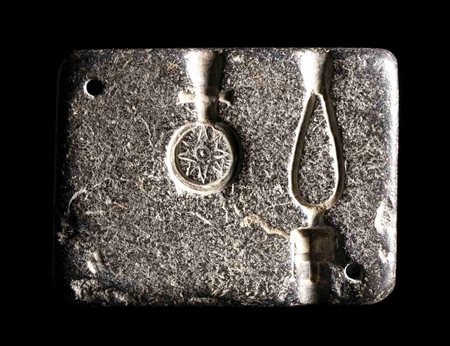 One half of a jewellery mould carved from a light coloured sandstone: used for making metal trinkets, and jewelry elements. It consists of a square block with matrices or negatives on both sides for casting trinkets, in lead or in gold. The matrices on one side include a disc element with star pattern inside, a pear-shaped cable pattern and a cross pattern. On opposite angles, presence of a hole that was used to fixed the other side of the matrice during the fusion.