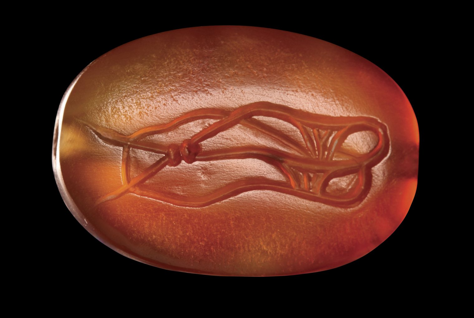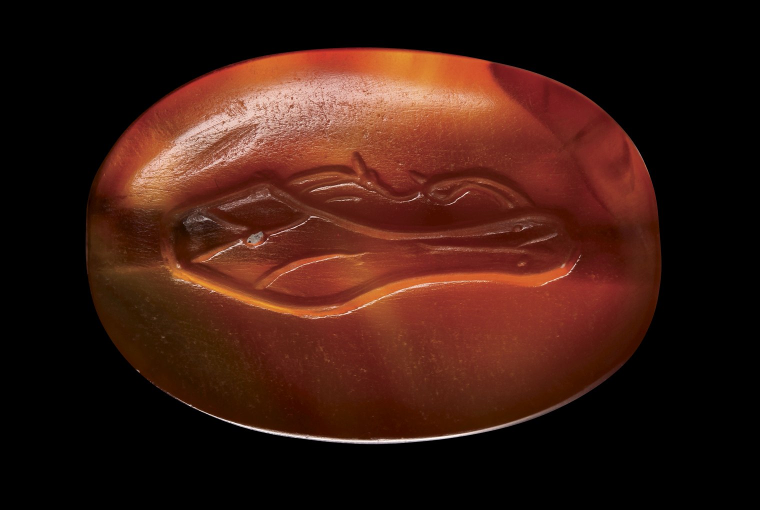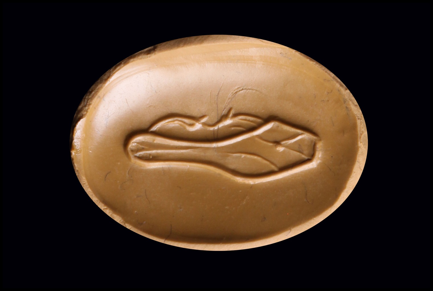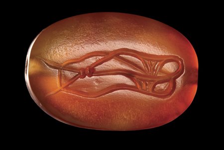 On the front side of the seal: sandal to the left, characterized by two long laces that cross in two spherical loops in the front. On the back of the stone: a variant of the sandal appears to be seen from underneath (from the sole with the laterals protruding open). The object is depicted with great realism and technical perfection. Through hole. Beautiful color of the stone. Wear marks. Of great rarity.