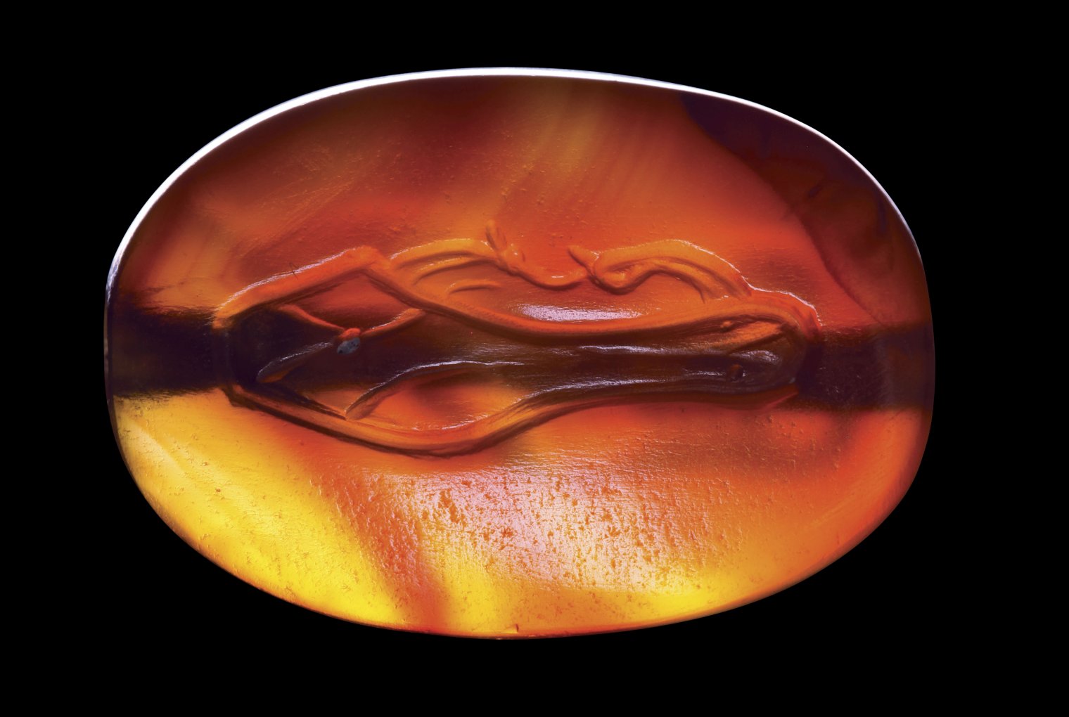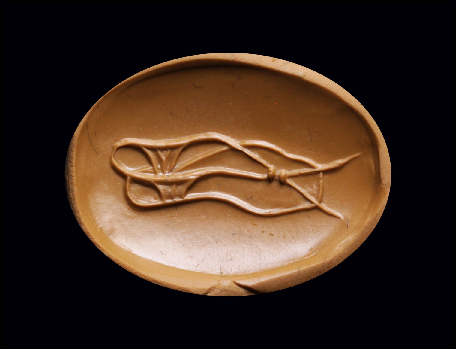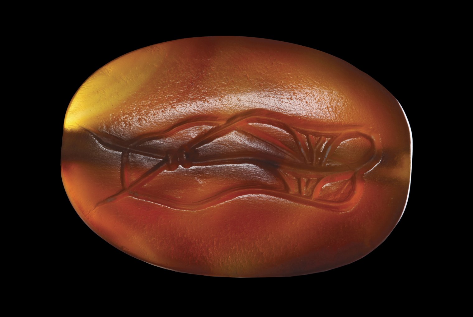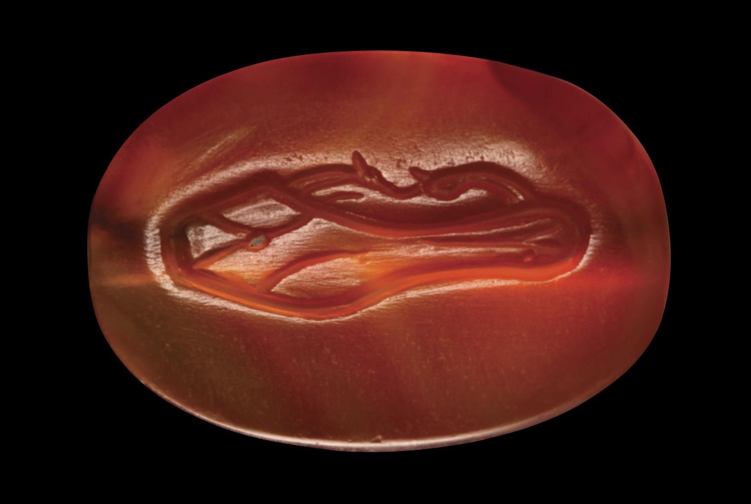 On the front side of the seal: sandal to the left, characterized by two long laces that cross in two spherical loops in the front. On the back of the stone: a variant of the sandal appears to be seen from underneath (from the sole with the laterals protruding open). The object is depicted with great realism and technical perfection. Through hole. Beautiful color of the stone. Wear marks. Of great rarity.