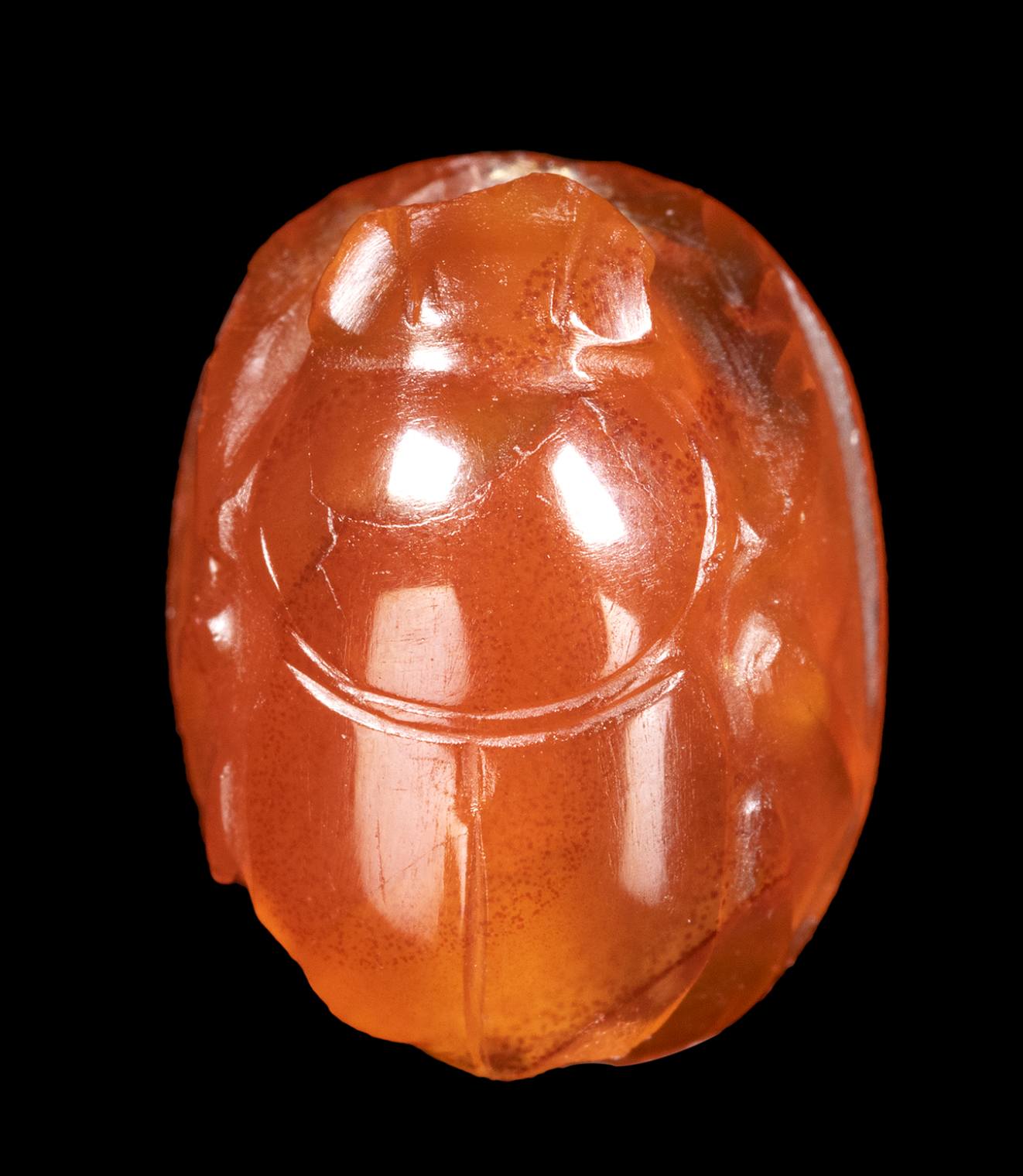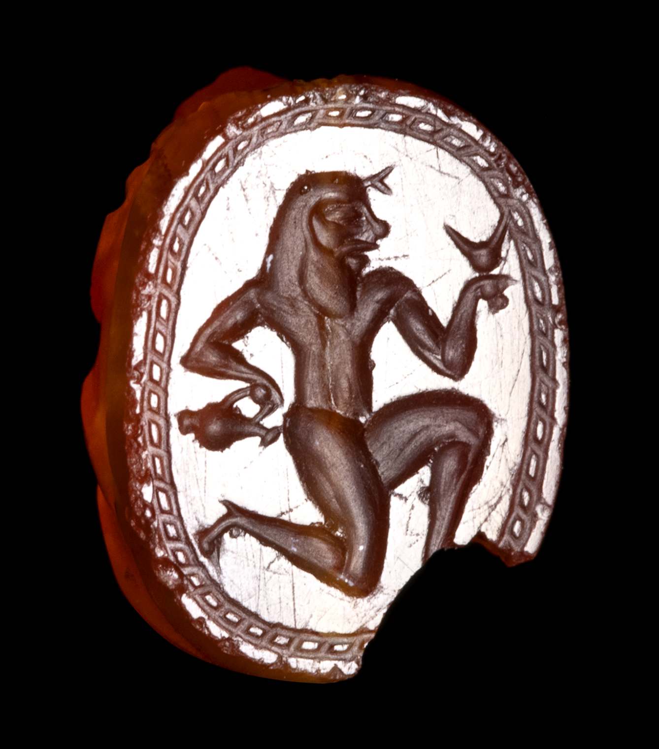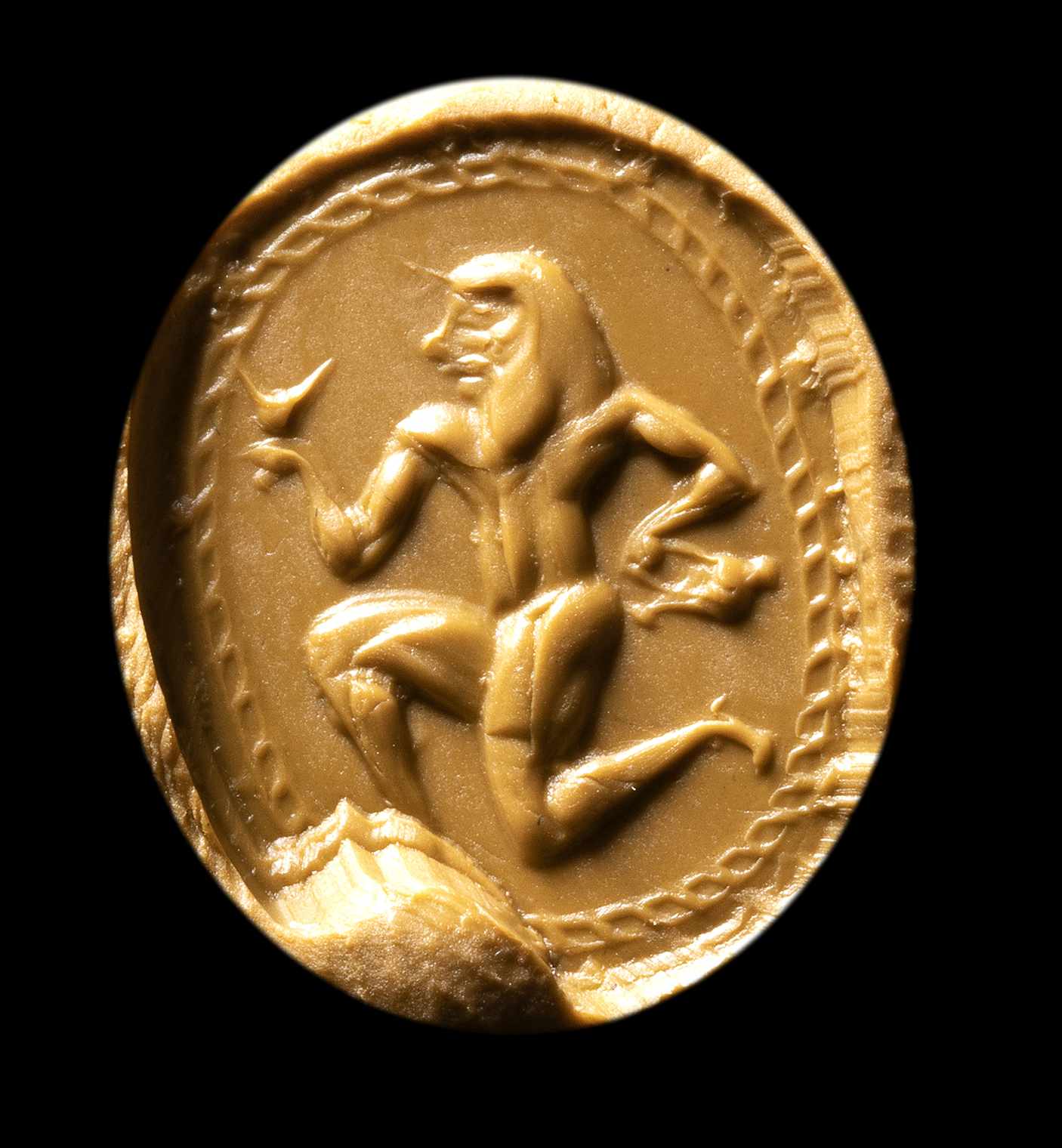 A GREEK CARNELIAN SCARAB. RUNNING SATYR.