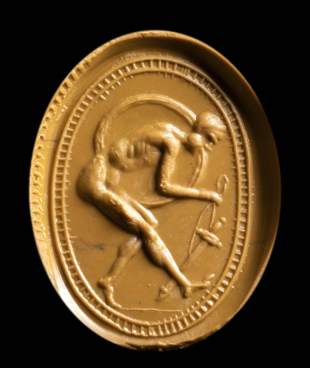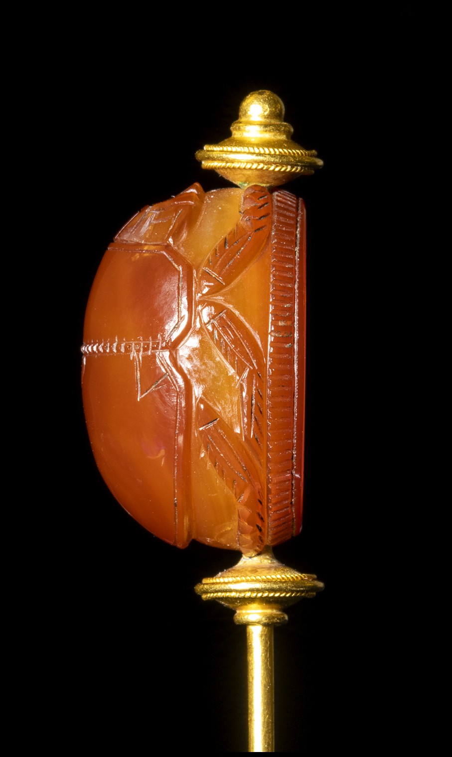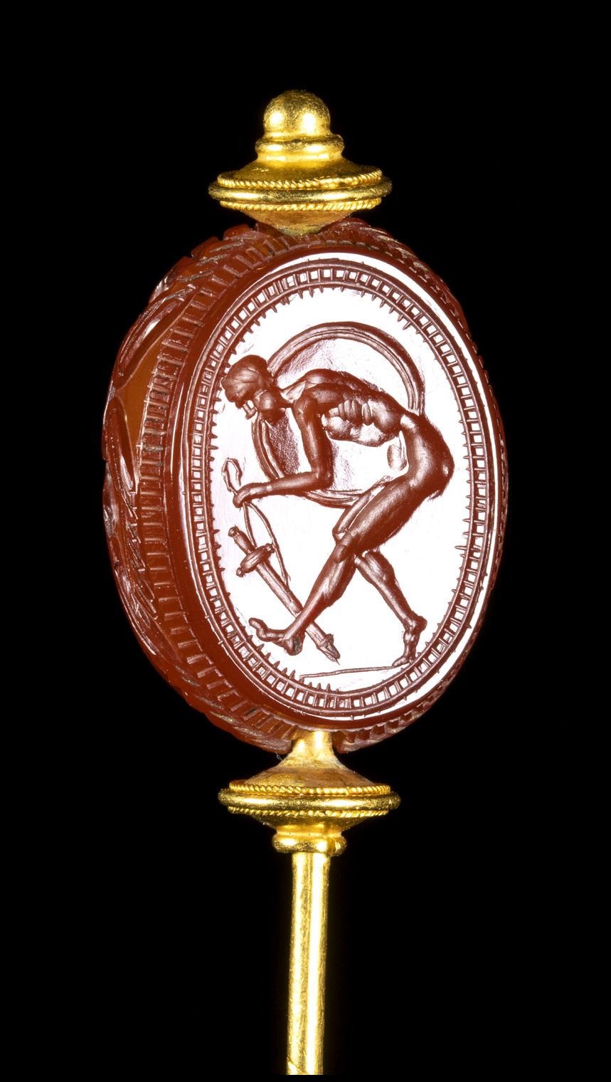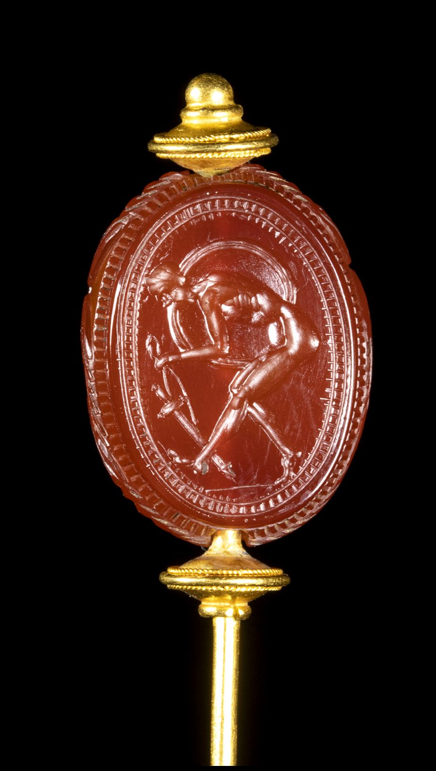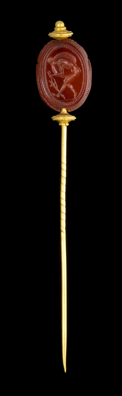 The warrior faces left. With his right arm he holds the shield, with the left hand the sword with scabbard. The figure is leaning forward. Hatched border. The scarab is mounted in an elegant archaeological revival style gold stick pin.