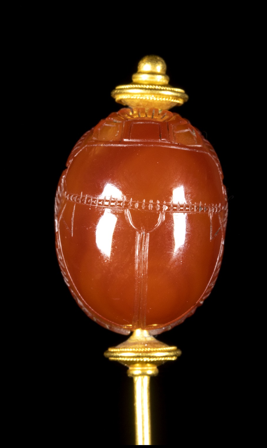 A GRAND TOUR CARNELIAN ENGRAVED SCARAB SET IN A GOLD STICK PIN. WARRIOR.