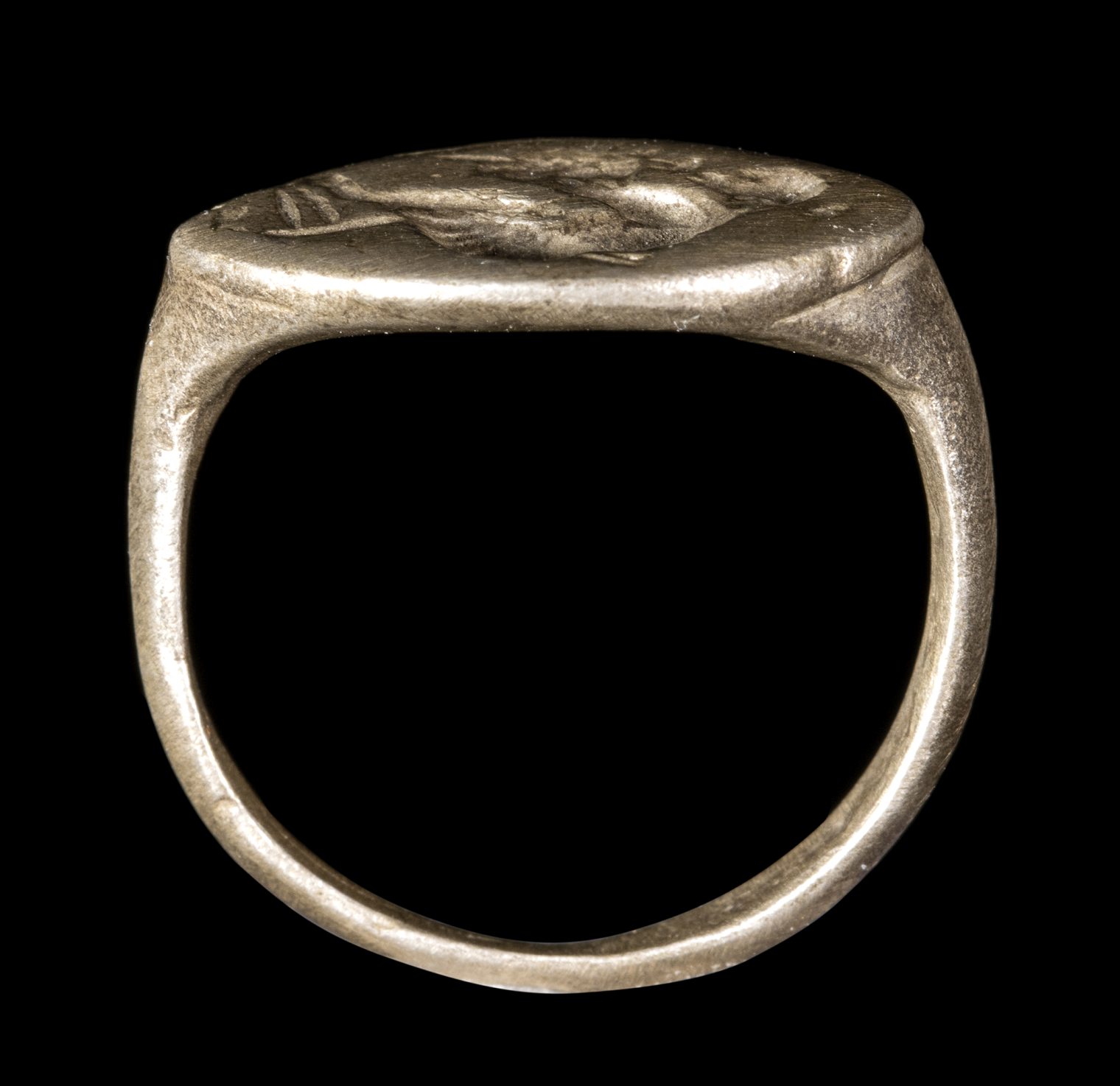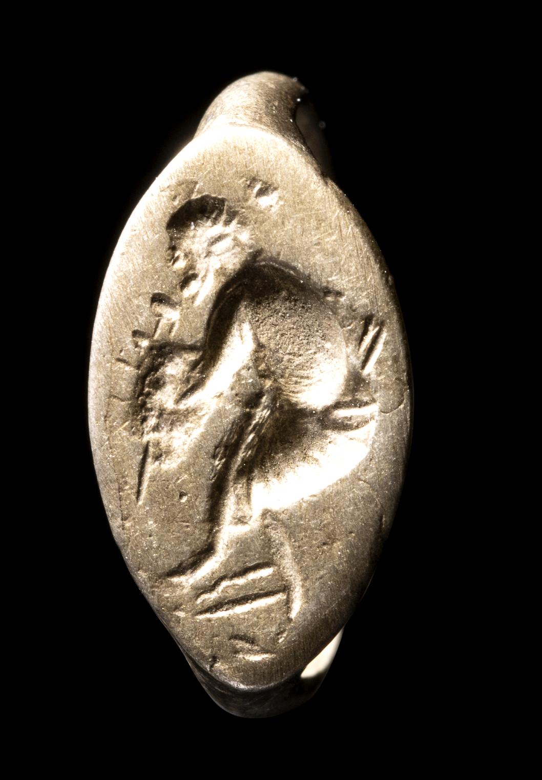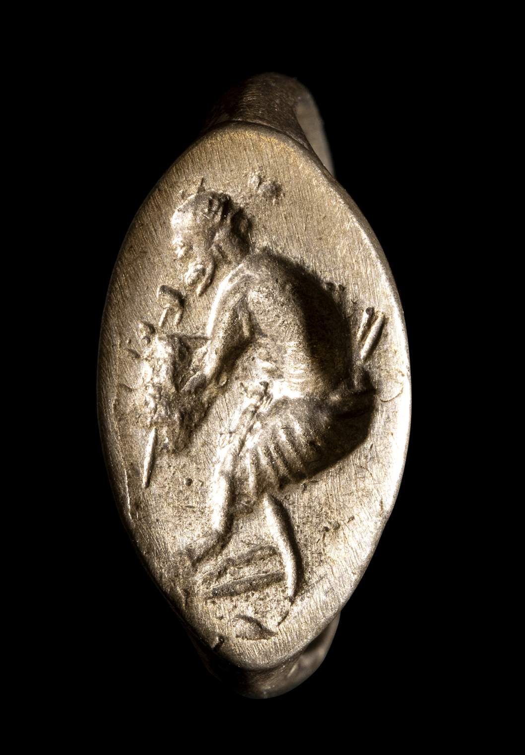 With rounded hoop, flatten within, and expanding onto an almond-shaped bezel with engraved design. A bold man facing left, the upper body uncovered and the lower body covered of hair. In his hands he holds the flute. Possibly a representation of a Silenus. Wear marks.