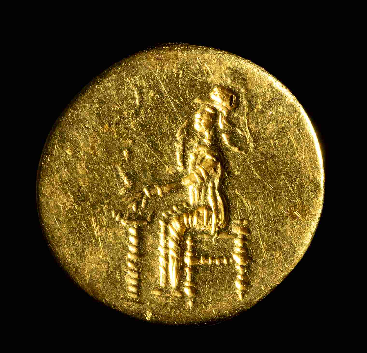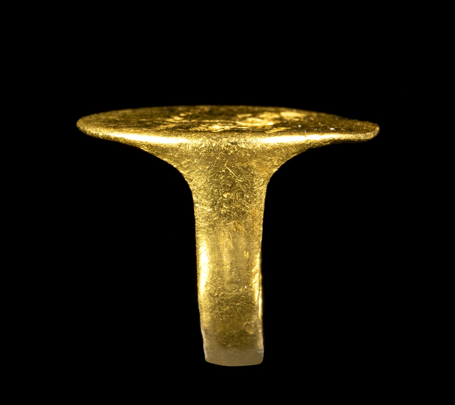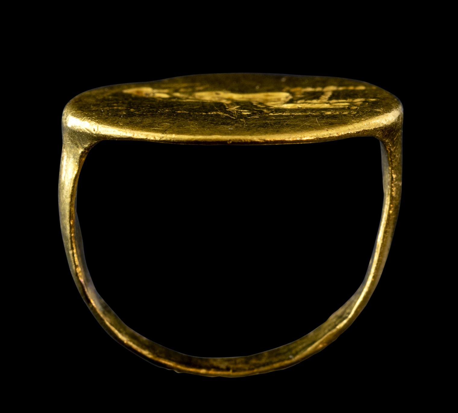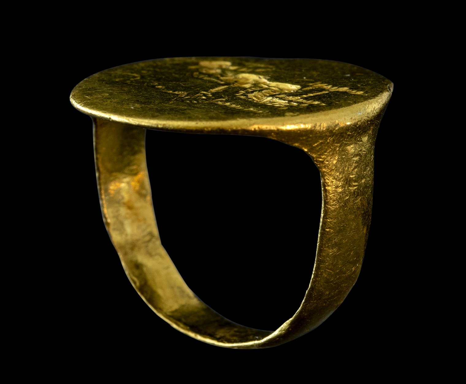 A RARE LATE CLASSICAL GREEK GOLD RING WITH THE ENGRAVED BEZEL. ATHENA SEATED IN FRONT OF A THYMATERION.