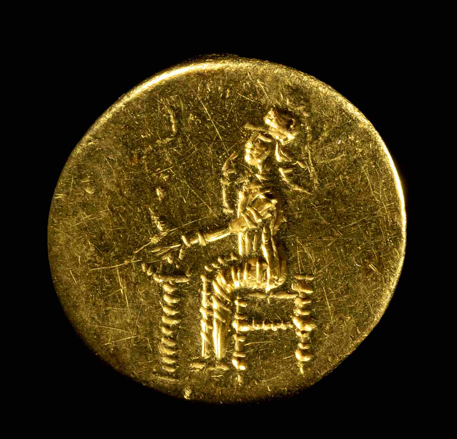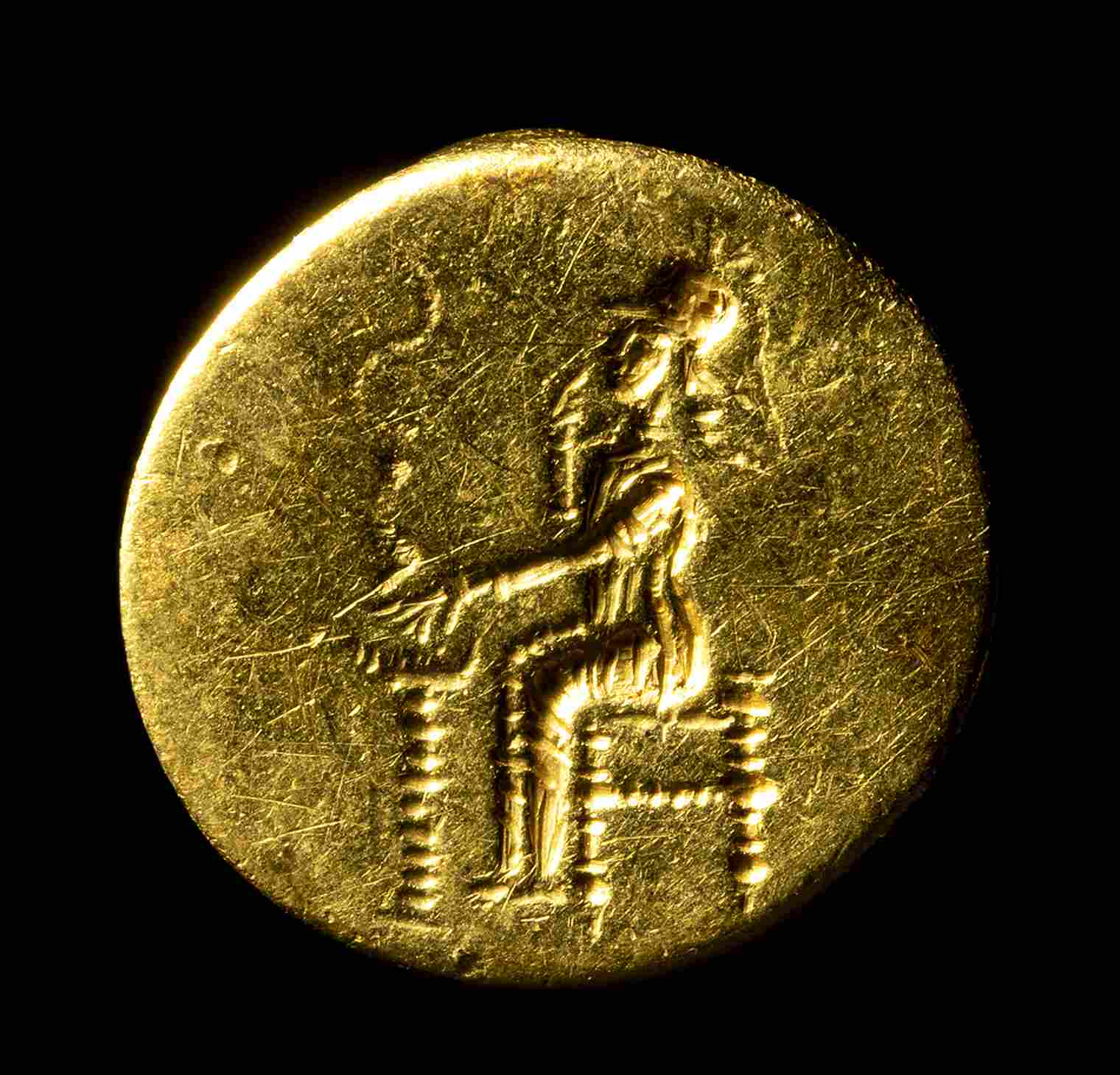 Hoop flat within, rounded without; large rounded bezel with engraved design; the helmeted goddess is seated on a chair facing left. She wears a long chiton and himation, her right hand near a face, meanwhile her left arm is strechted toward a thymiaterion with incense burning. Wear marks.