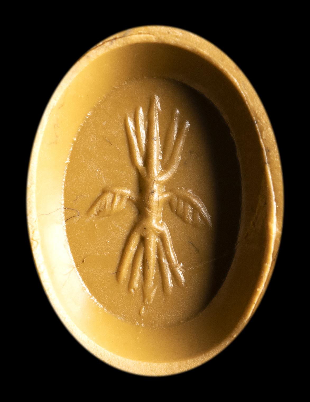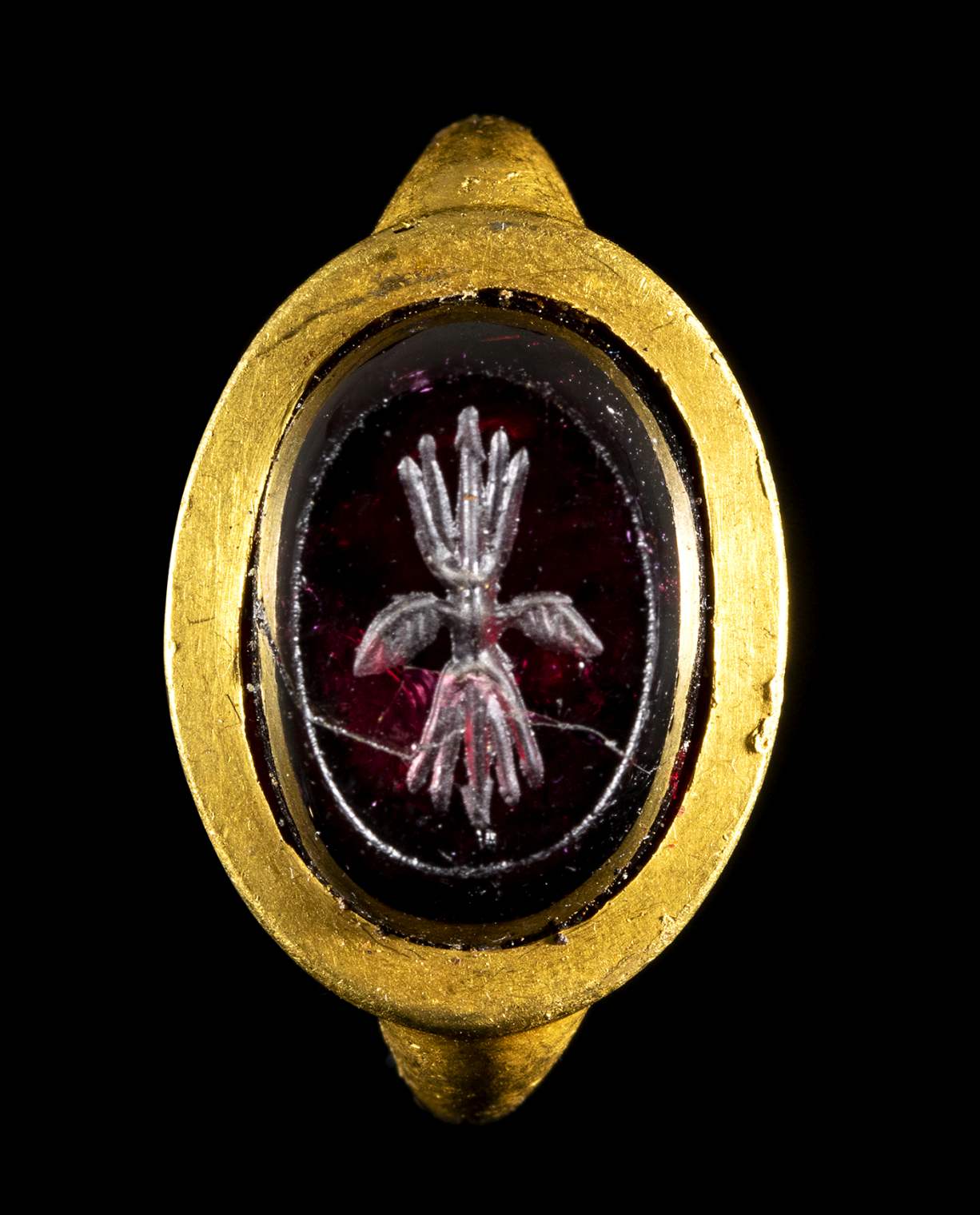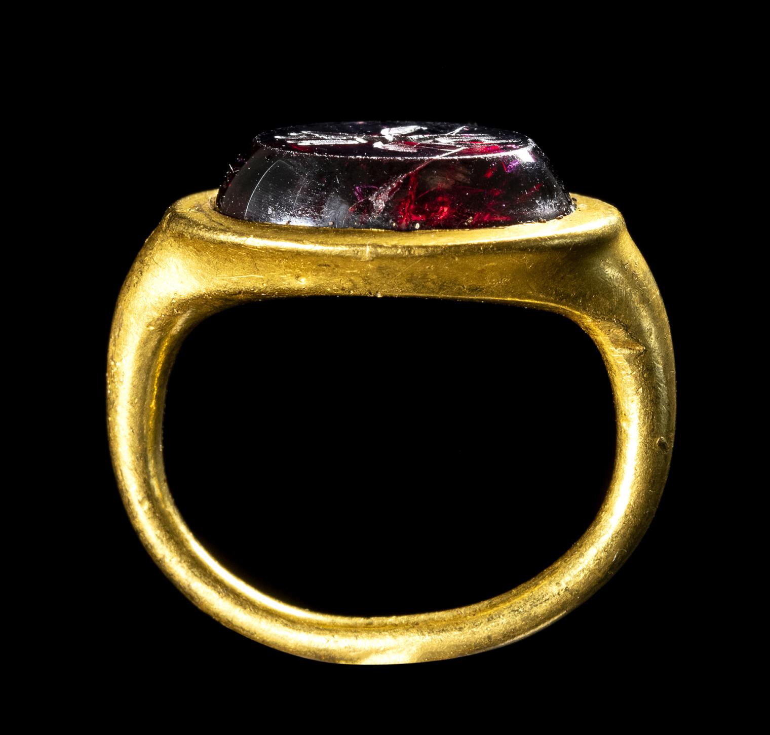 With rounded hoop expanding upwards on the shoulders and surmounting a large oval bezel with thick edges, containg a high raised garnet intaglio; thunderbolt. Crack on the stone and wear marks. Good overall conservation.