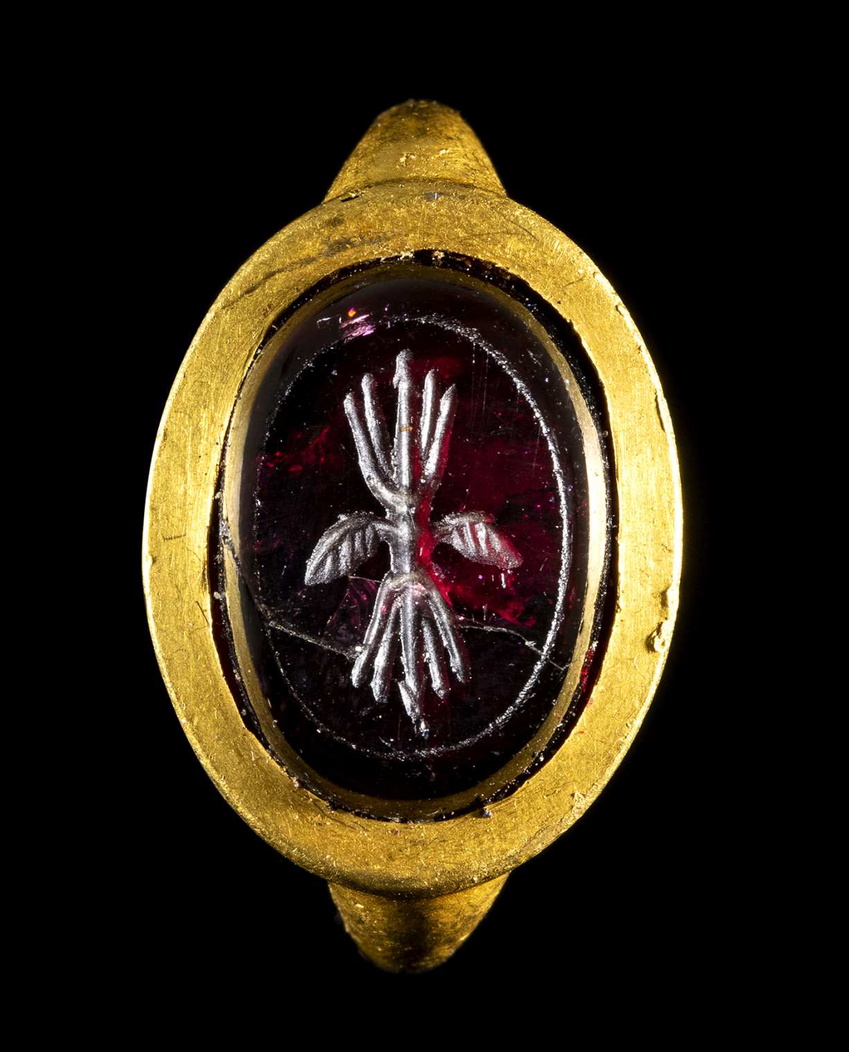 A LATE GREEK HELLENISTIC GOLD RING WITH A GARNET INTAGLIO. THUNDERBOLT.