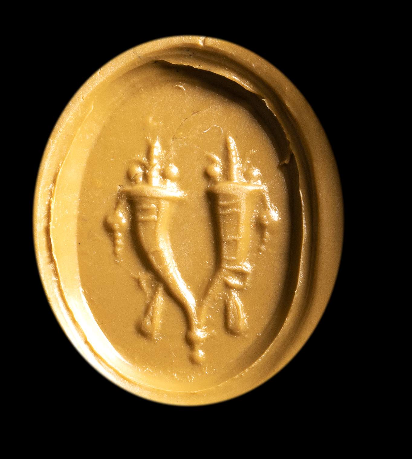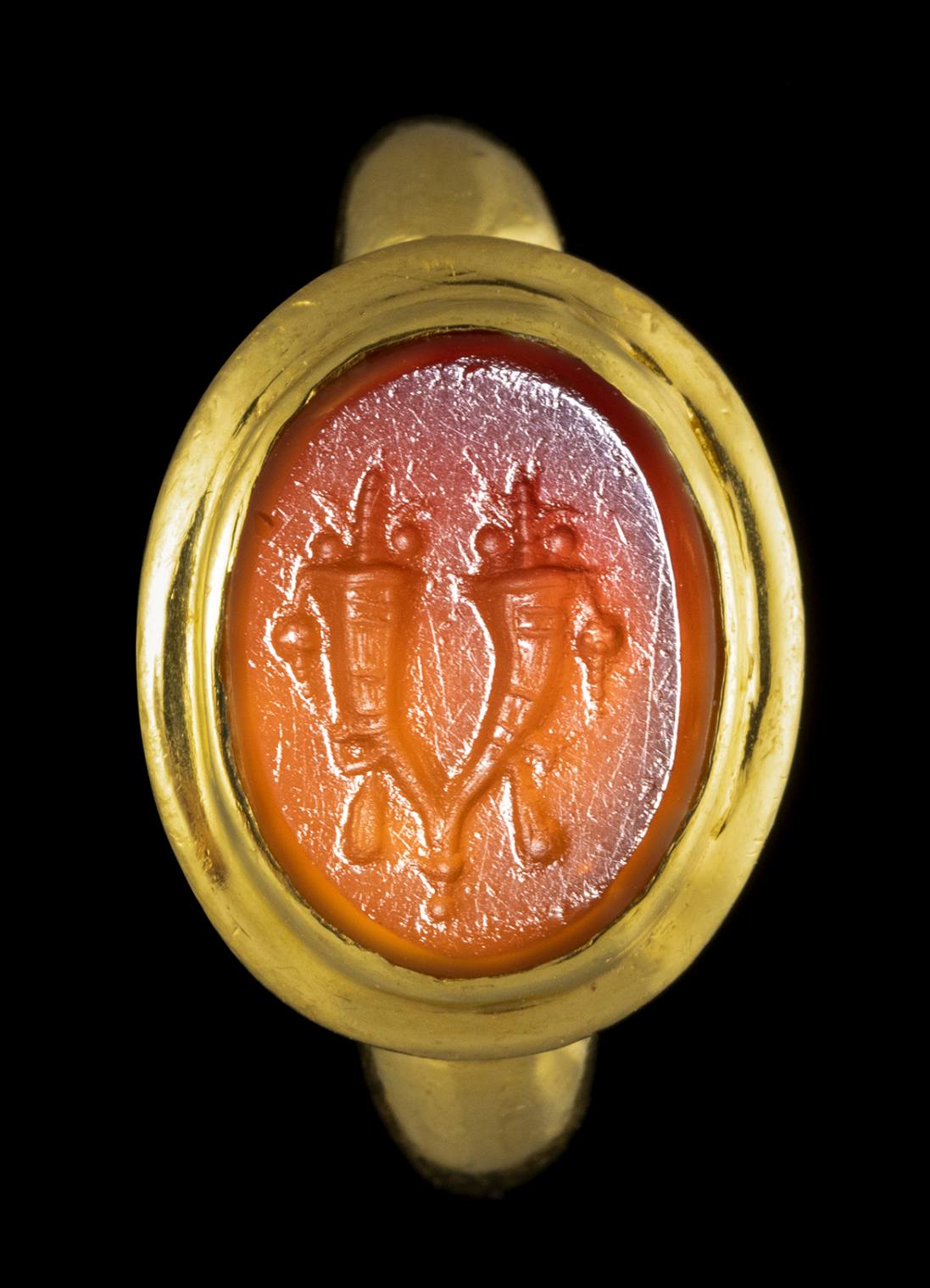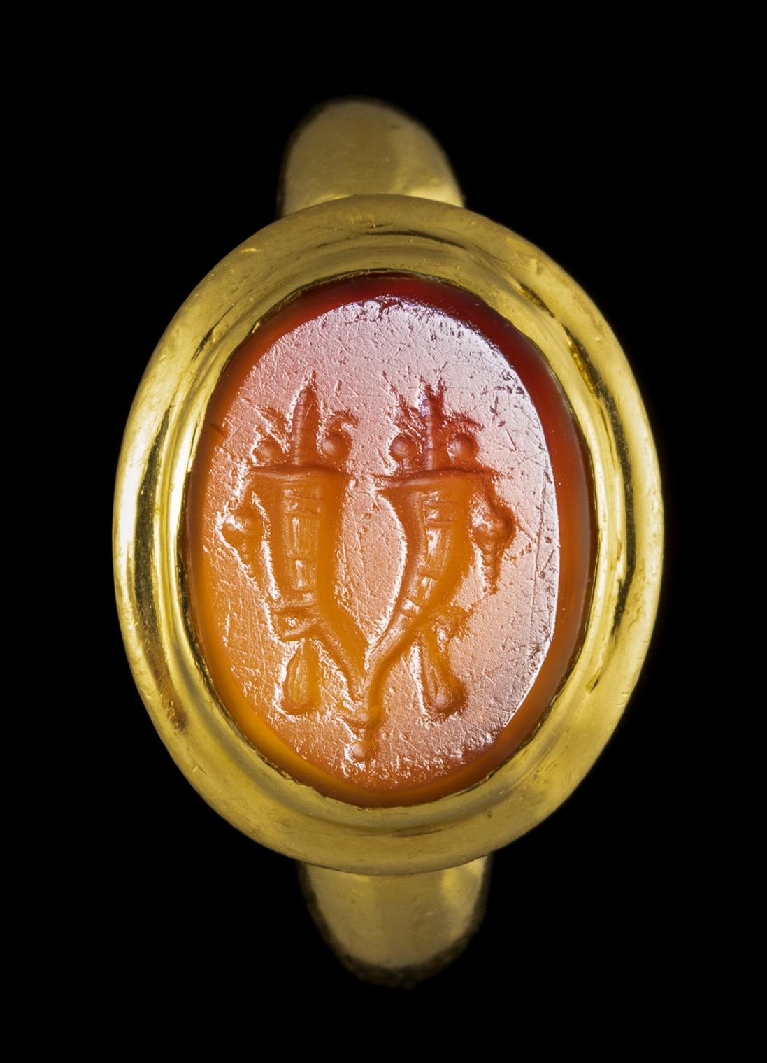 AN ITALIC CARNELIAN INTAGLIO SET IN A MODERN GOLD RING. DOUBLE CORNUCOPIA.