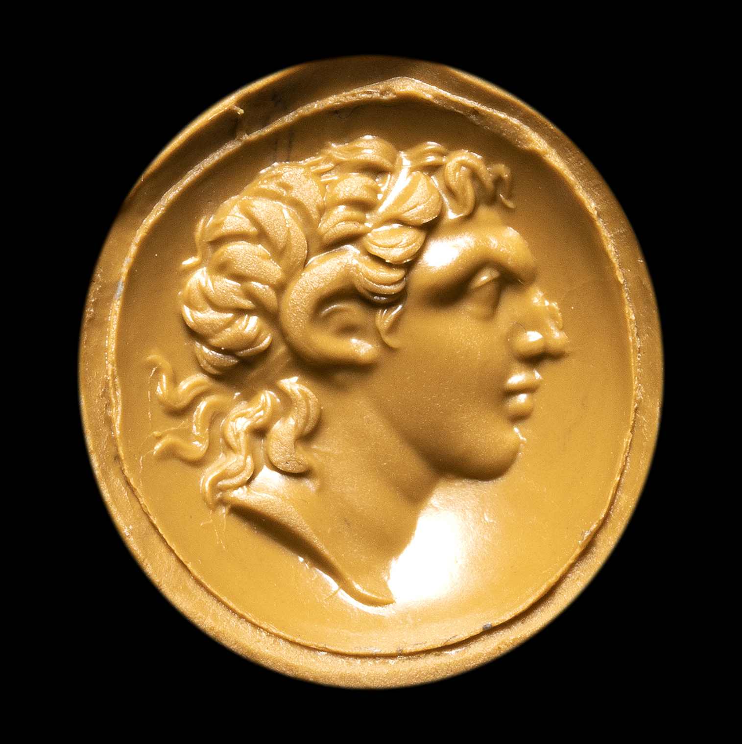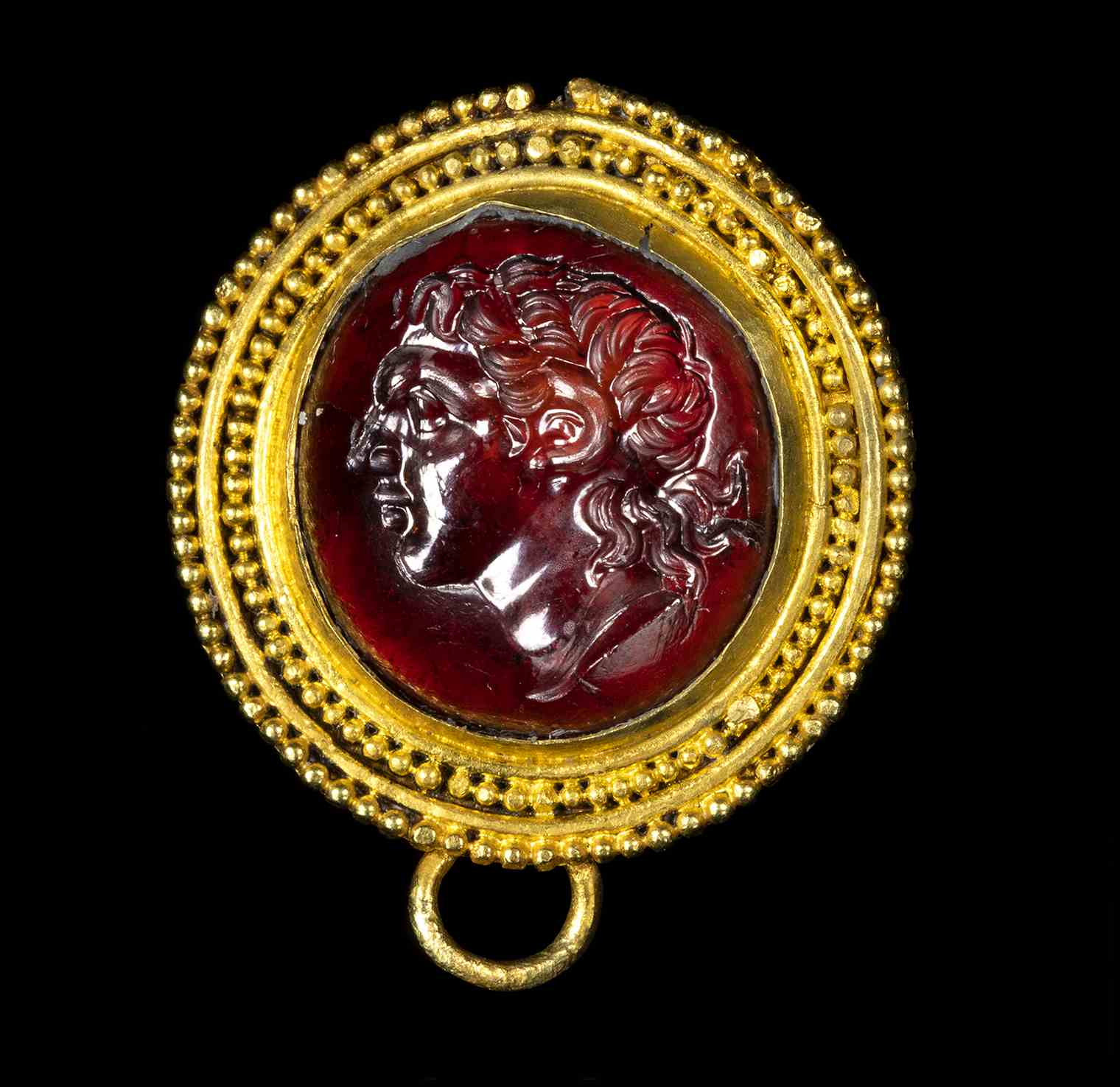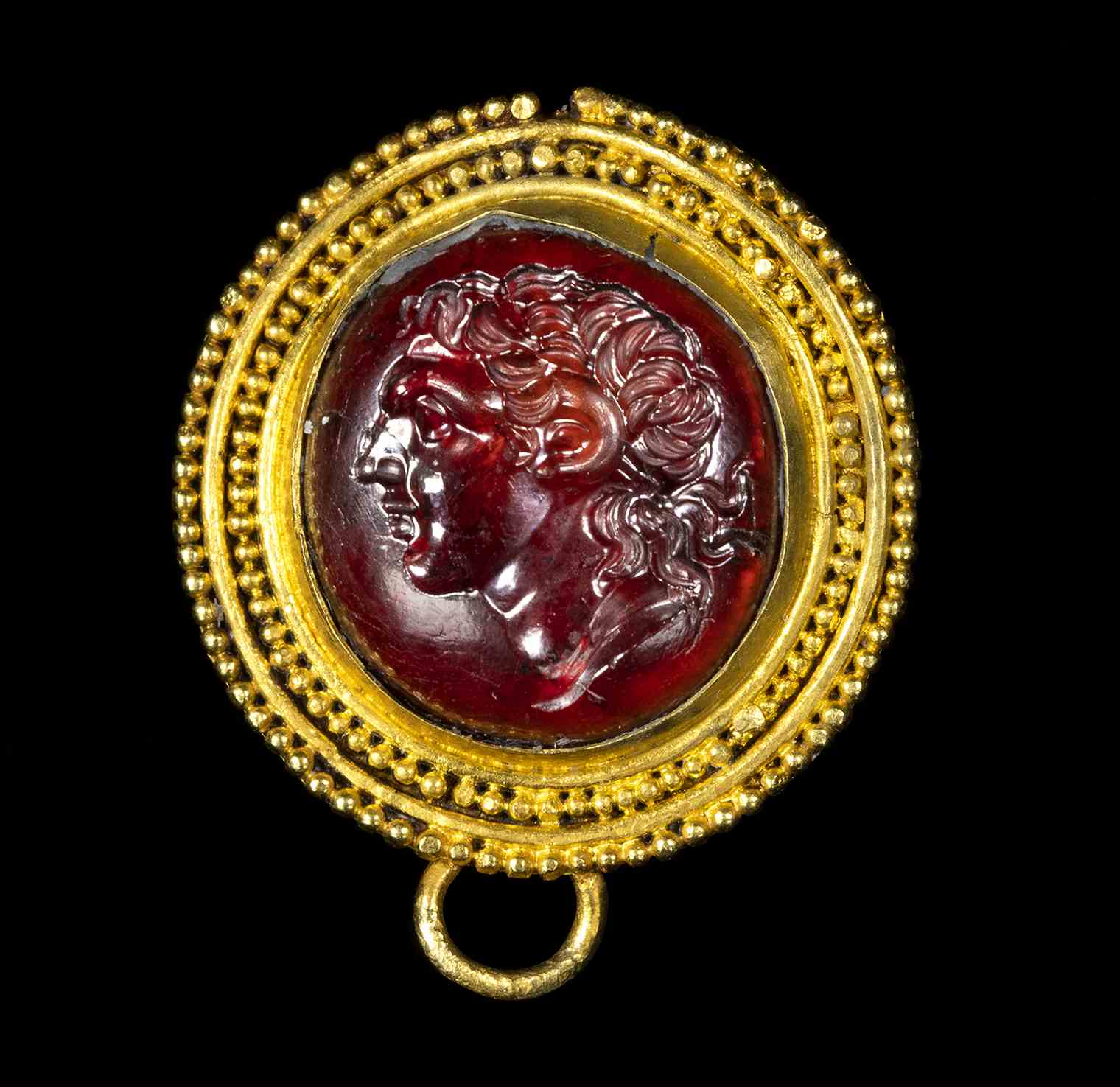 The gold ornament is round and adorned with two series of gold spherical beads divided in platted gold. Presence of a suspension hoop, (missing the other one). In the center, a large circular, slightly cabochon garnet intaglio figuring the portrait of Alexander the Great facing left. He is characterized by the typical presence of the Amon's horns and the the long hair. The presence of some globular elements for the anatomical details is referable to a Greek workshop.Wear marks.