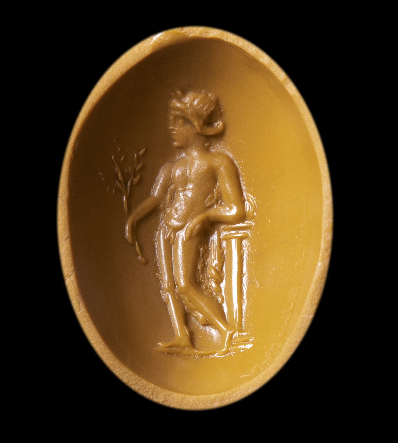 The deity leans against a column, with the body in three-quarters view and the head in profile to the right. With the left hand he is holding a laurel branch. Groundline. Slight wear marks.