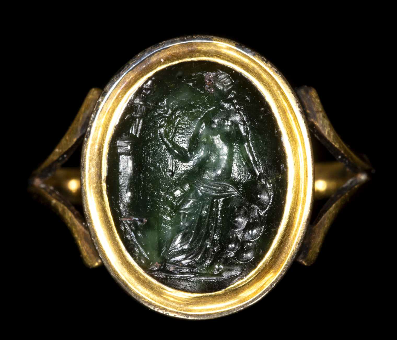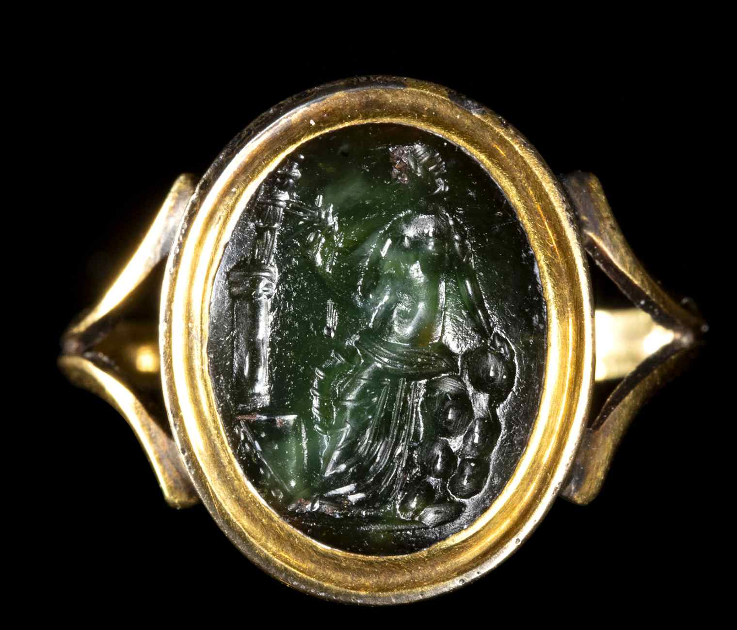 With a rounded hoop expanding in the shoulders in two branches and surmounting a grooved box setting with a chalcedony intaglio showing a woman facing left and seated on rocks. She is partially naked, the lower body covered by a folded drapery, her long hair tied behind in a bun. She is offering a laurel wreath to an idol on a column in front of her. Groundline. Wear marks. Nice vivid green color of the stone.