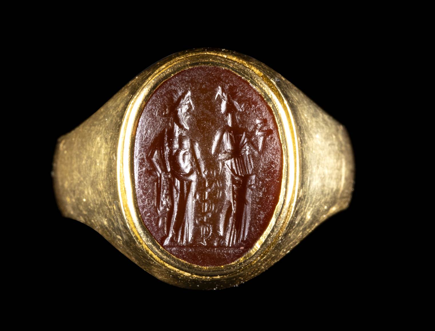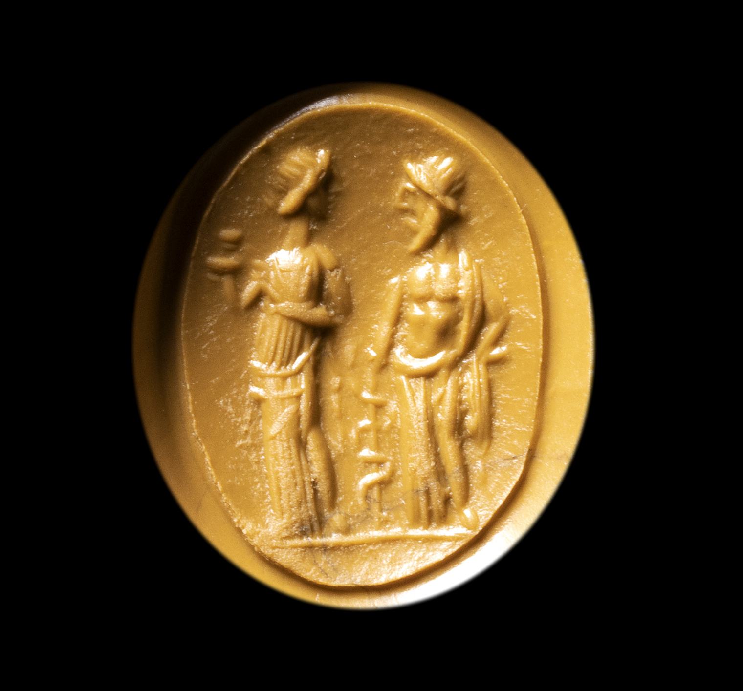 A ROMAN CARNELIAN INTAGLIO SET IN A GOLD RING. ASCLEPIUS AND HYGIEIA
