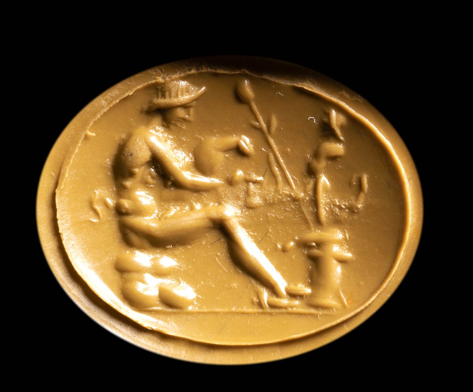 The scene shows the satyr seated on a rock and facing left. He is making offers to Priapus in the shape of an herm on a short column. Thyrsus. Groundline. Wear marks.